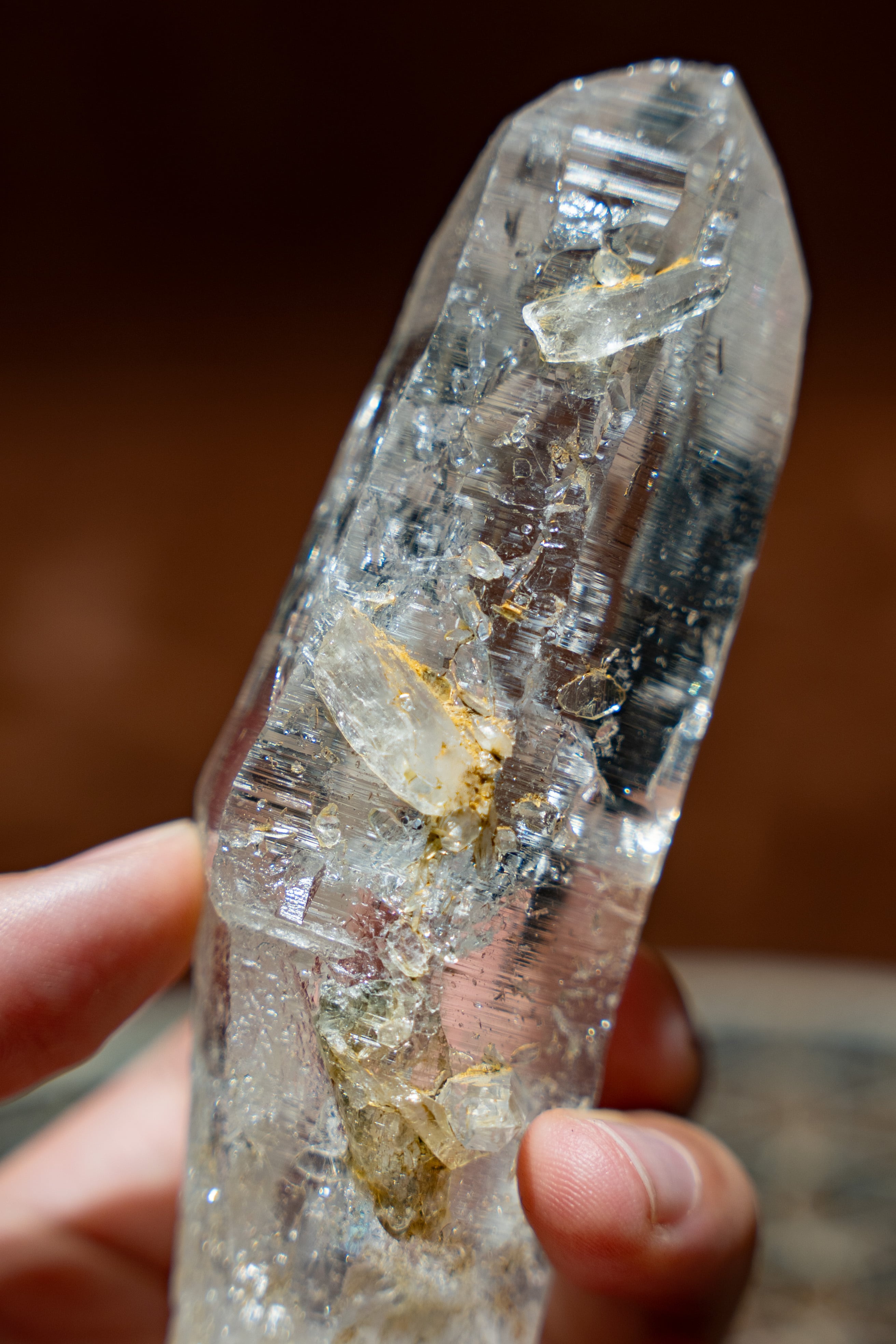 この鉱山の特徴として、真っ直ぐで長く、先端にかけて細くなる形状をした結晶が多く産出されます。これはクル地区産の水晶では珍しく、近くのブリハスパティーやマニハールではこのような形状の結晶があまり産出されません。