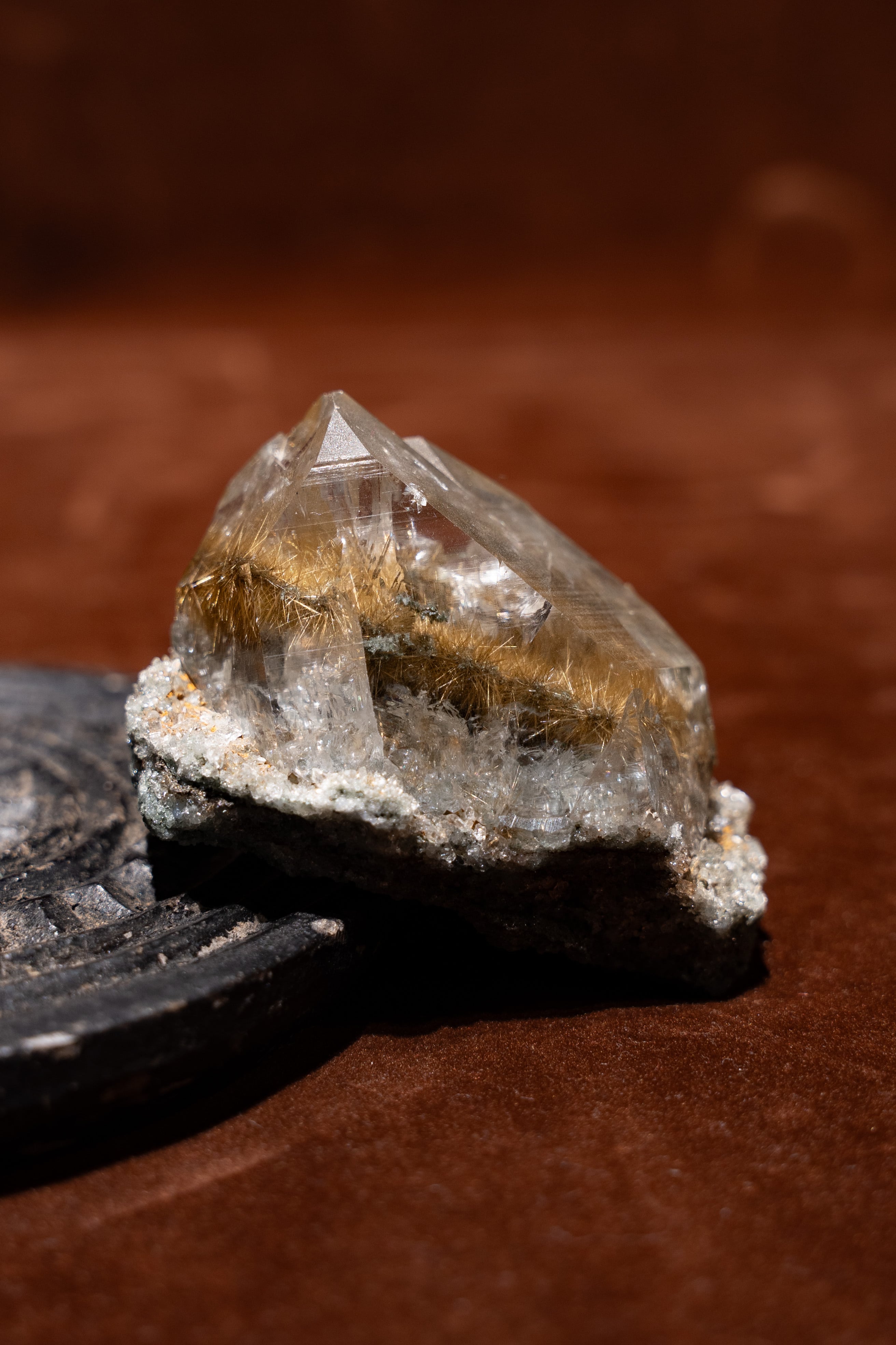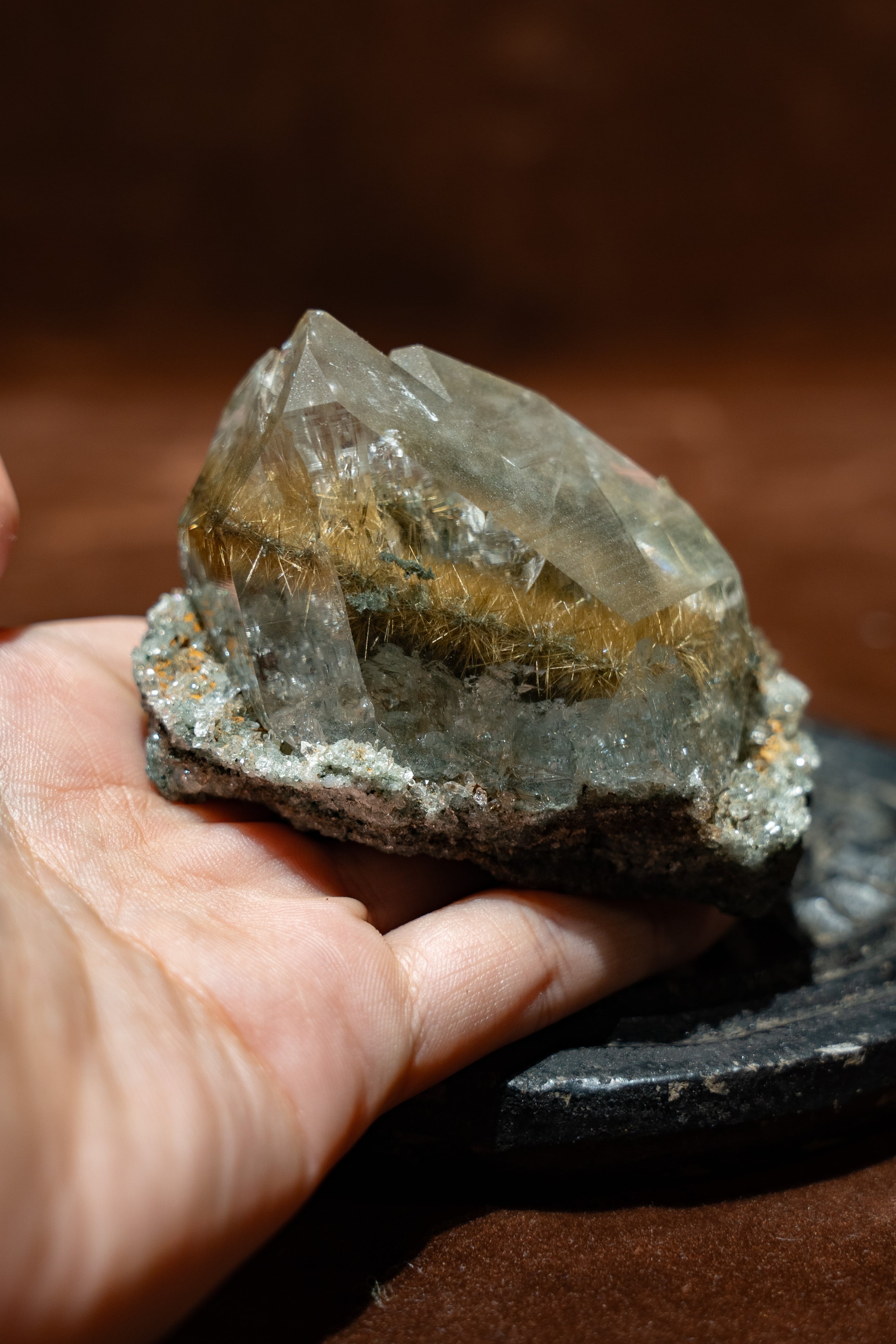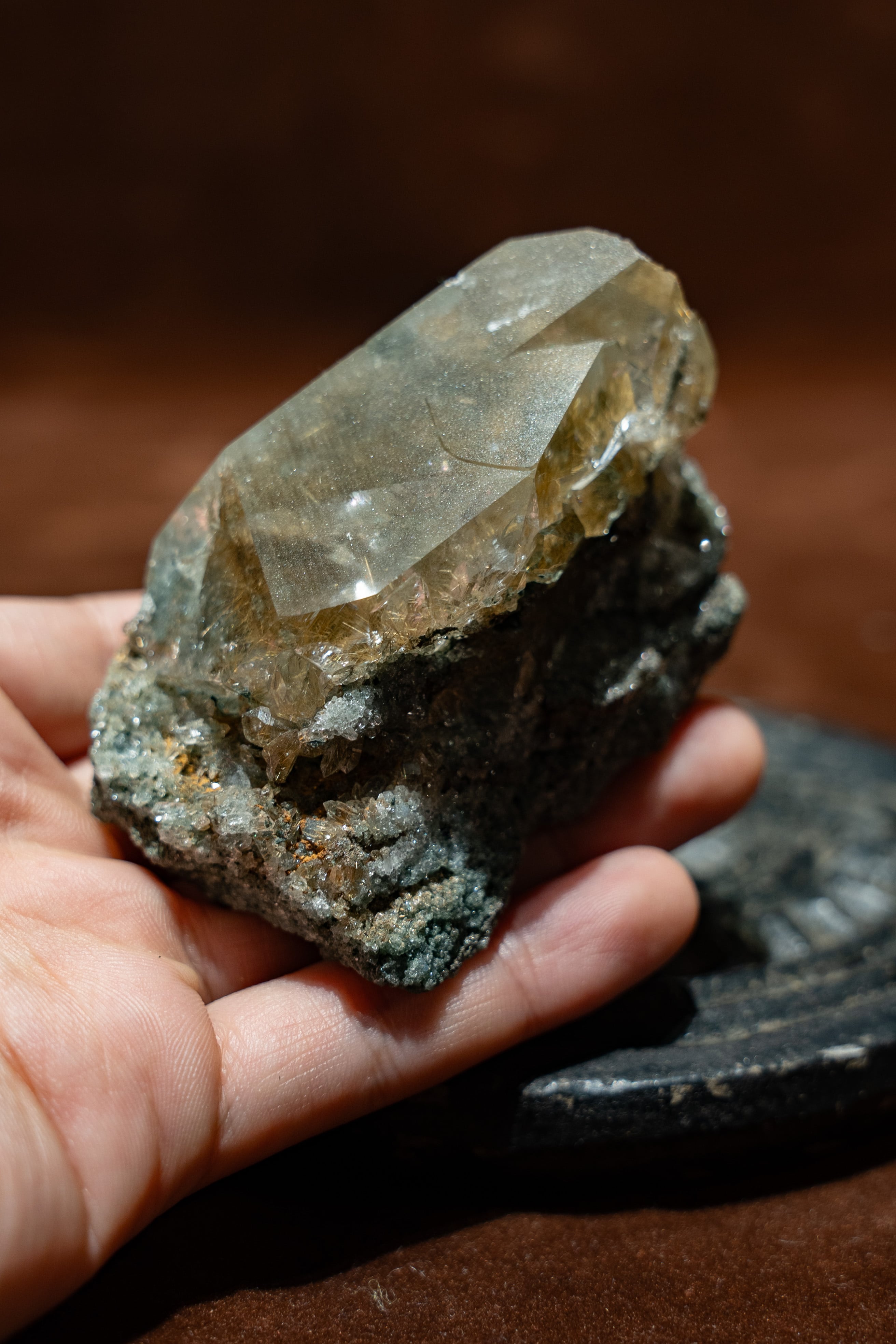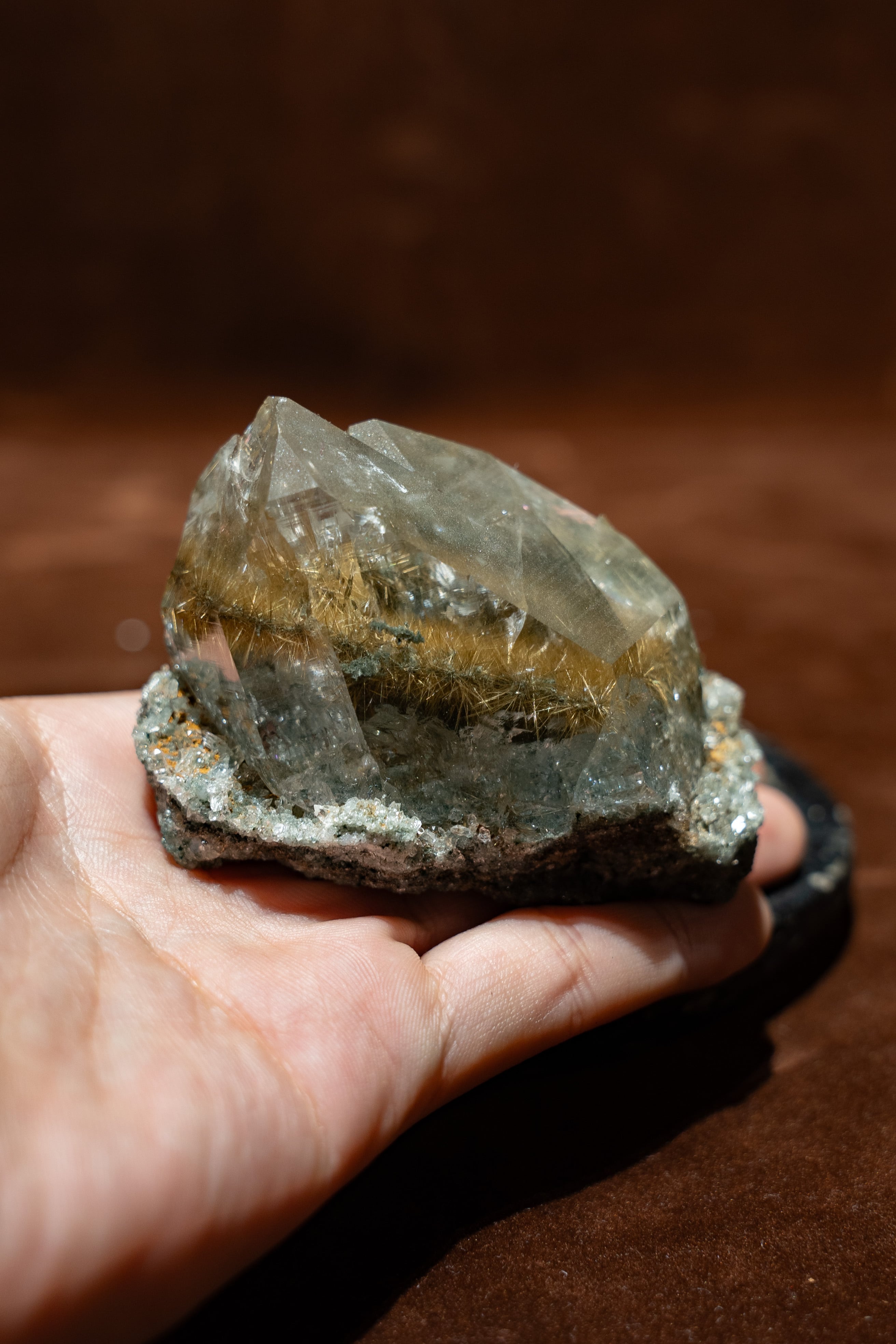 光に当てると、そのルチルが優しく煌めき、見ていて飽きる事がありません。