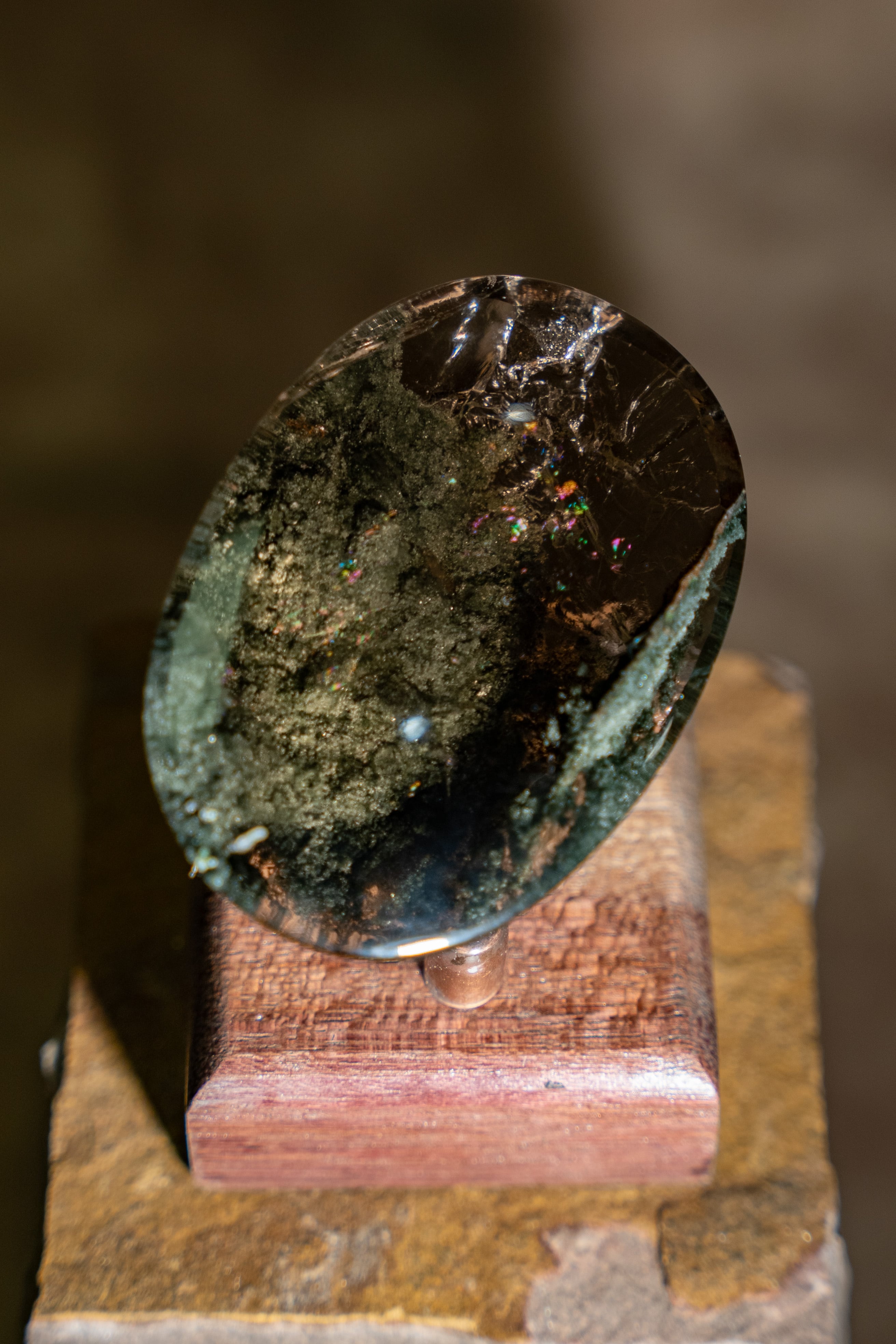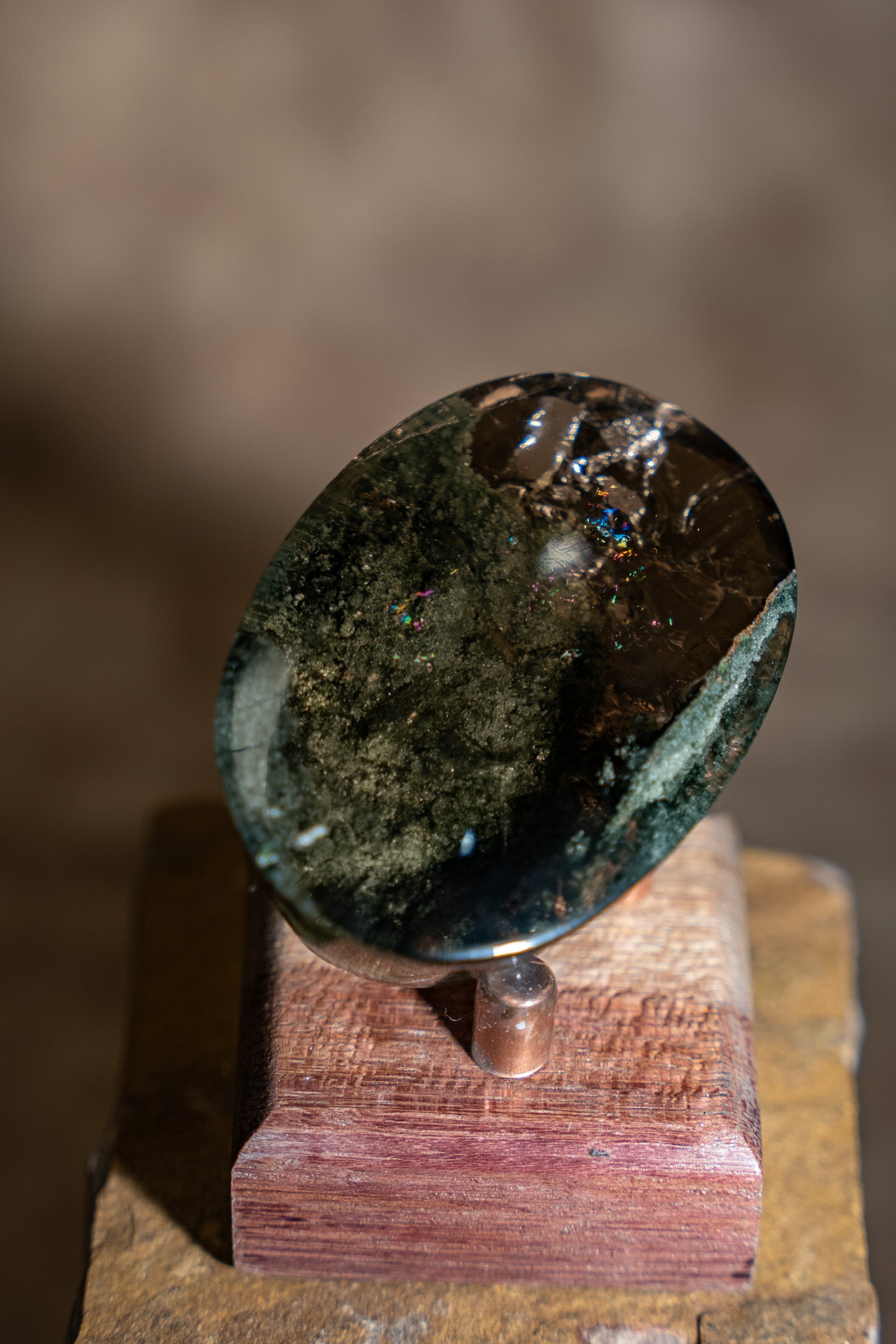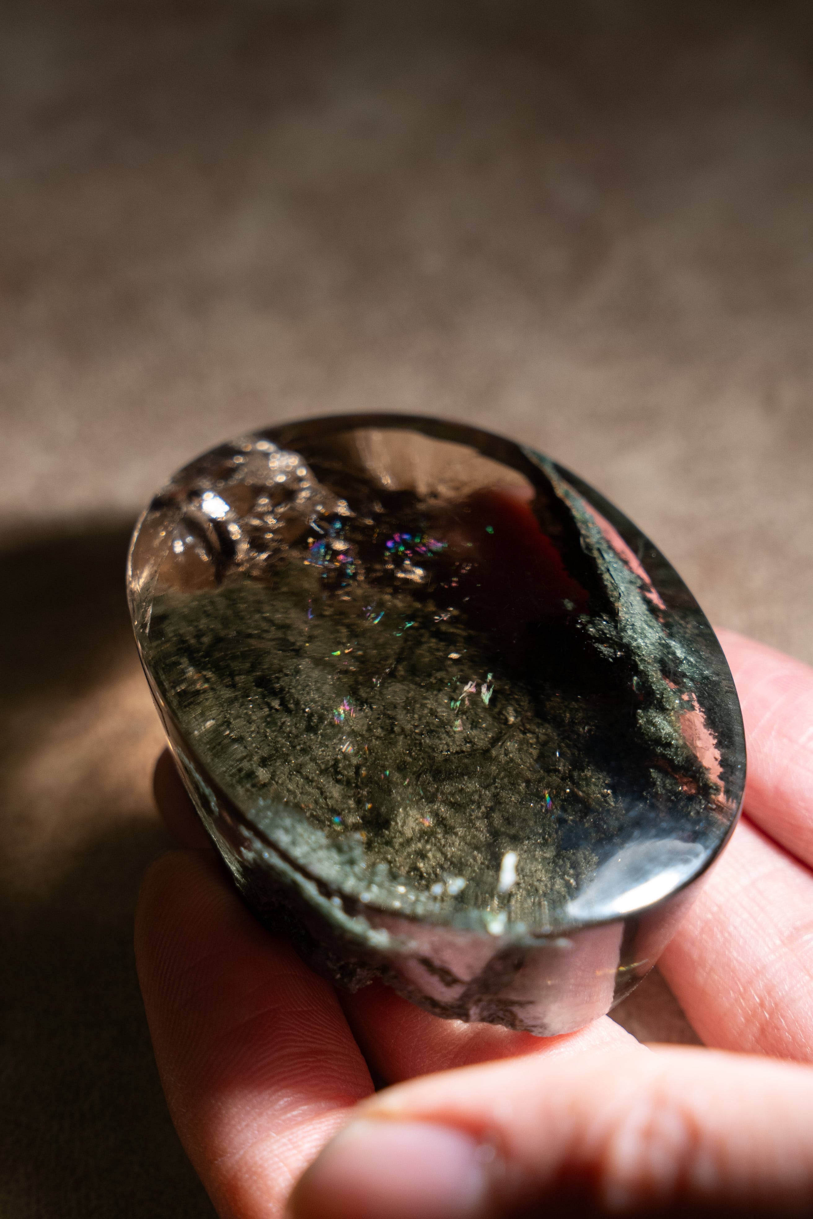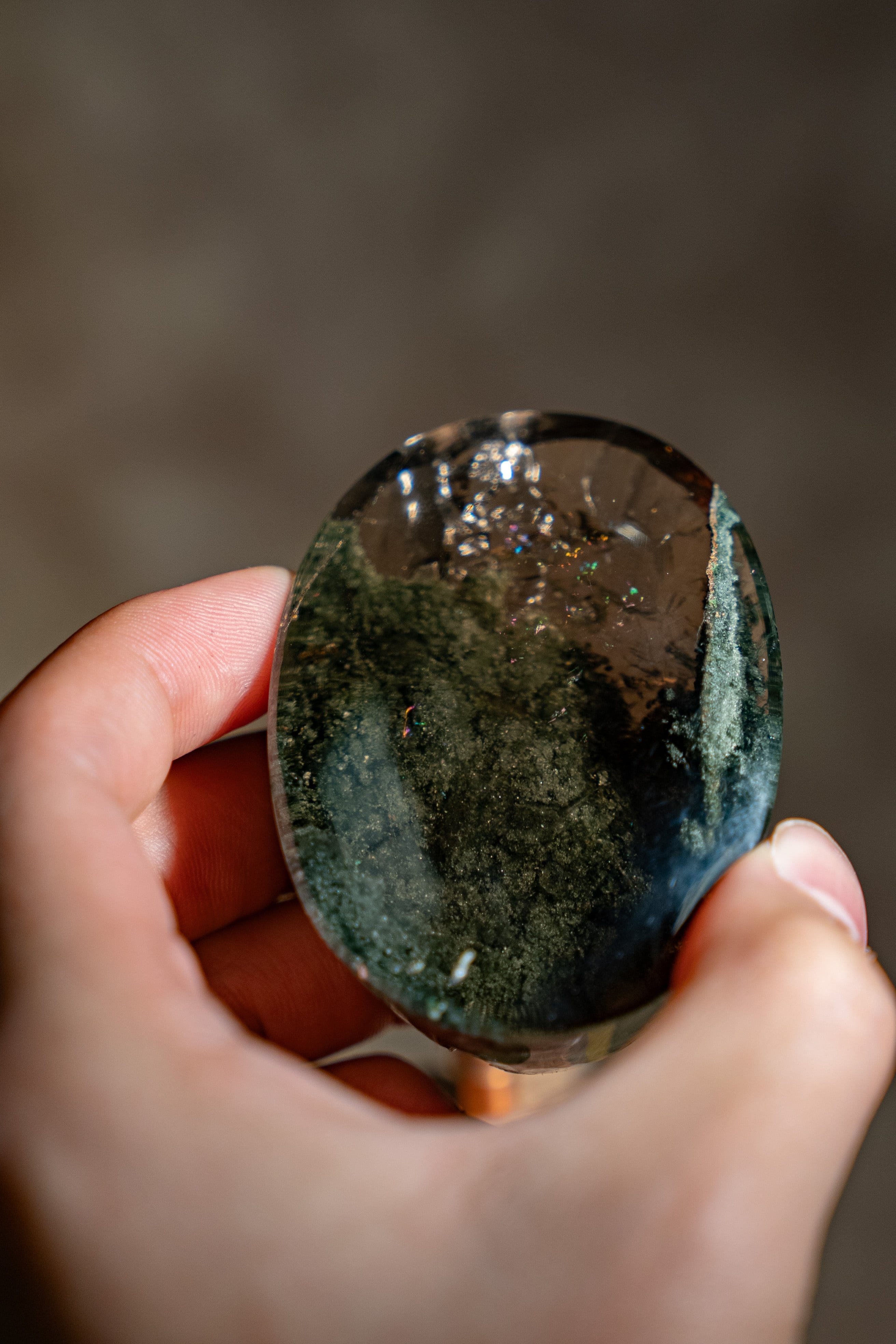 大きな虹も内包しており、艶やかな水晶の中にクローライトが織りなす世界は、