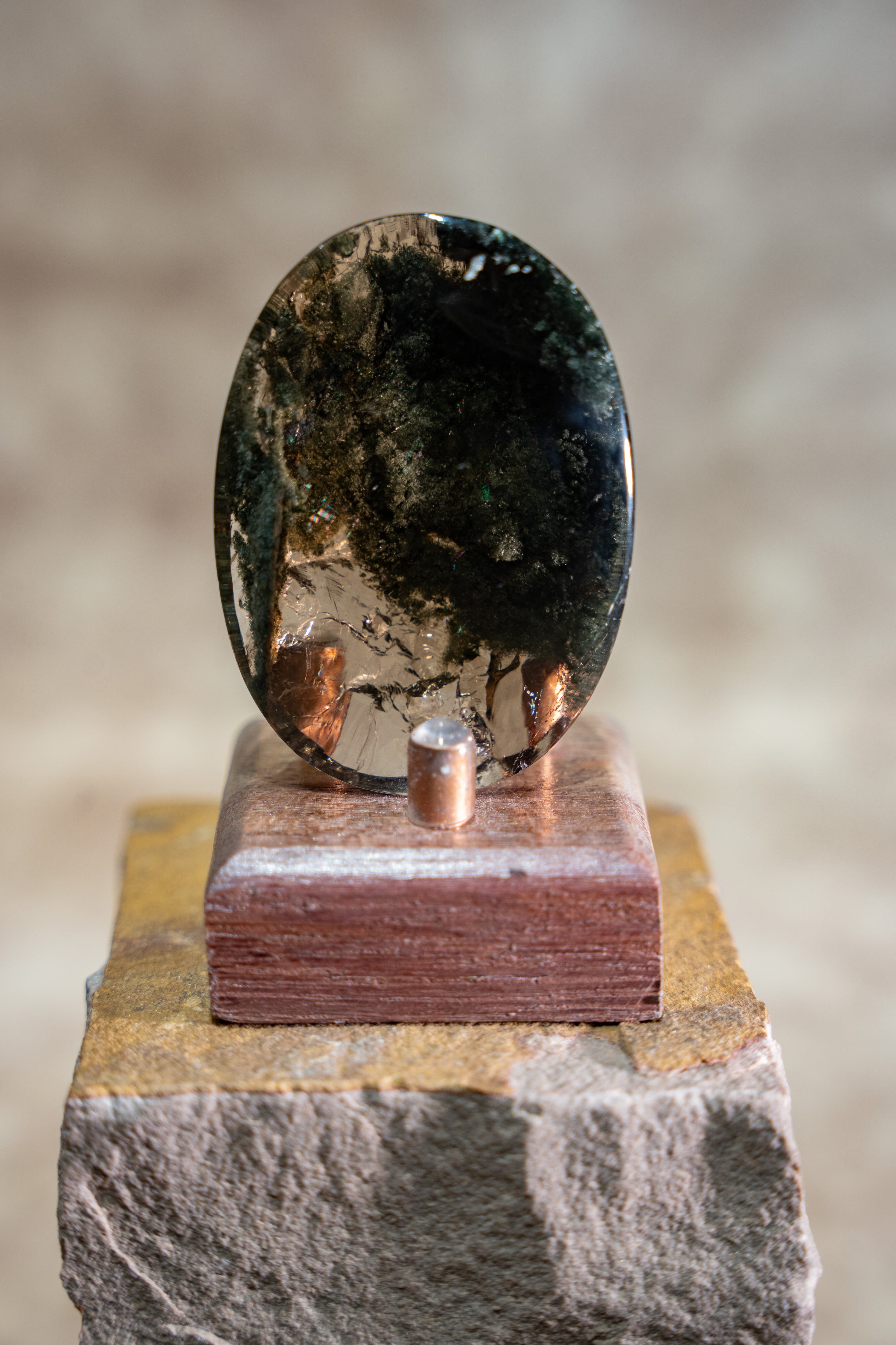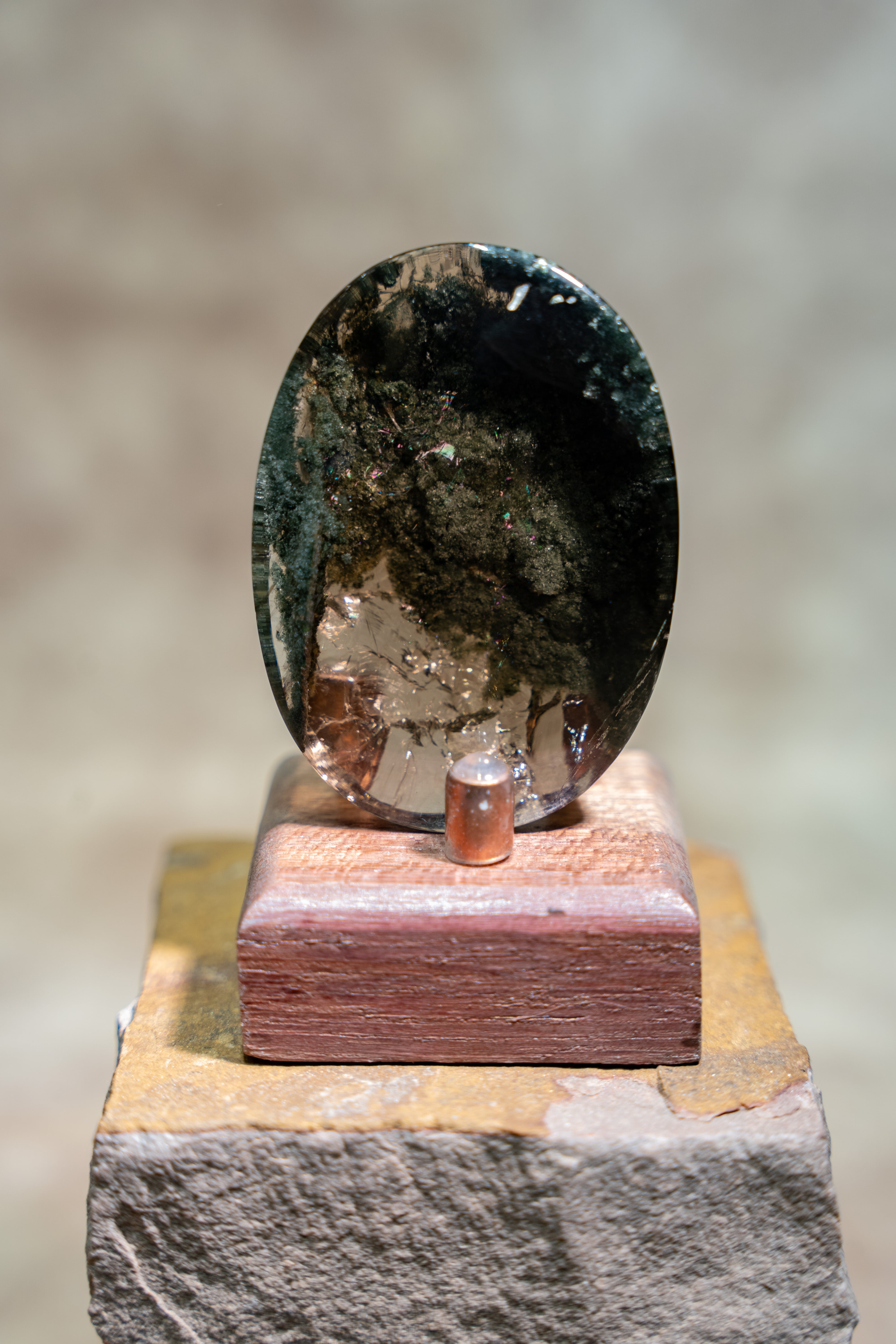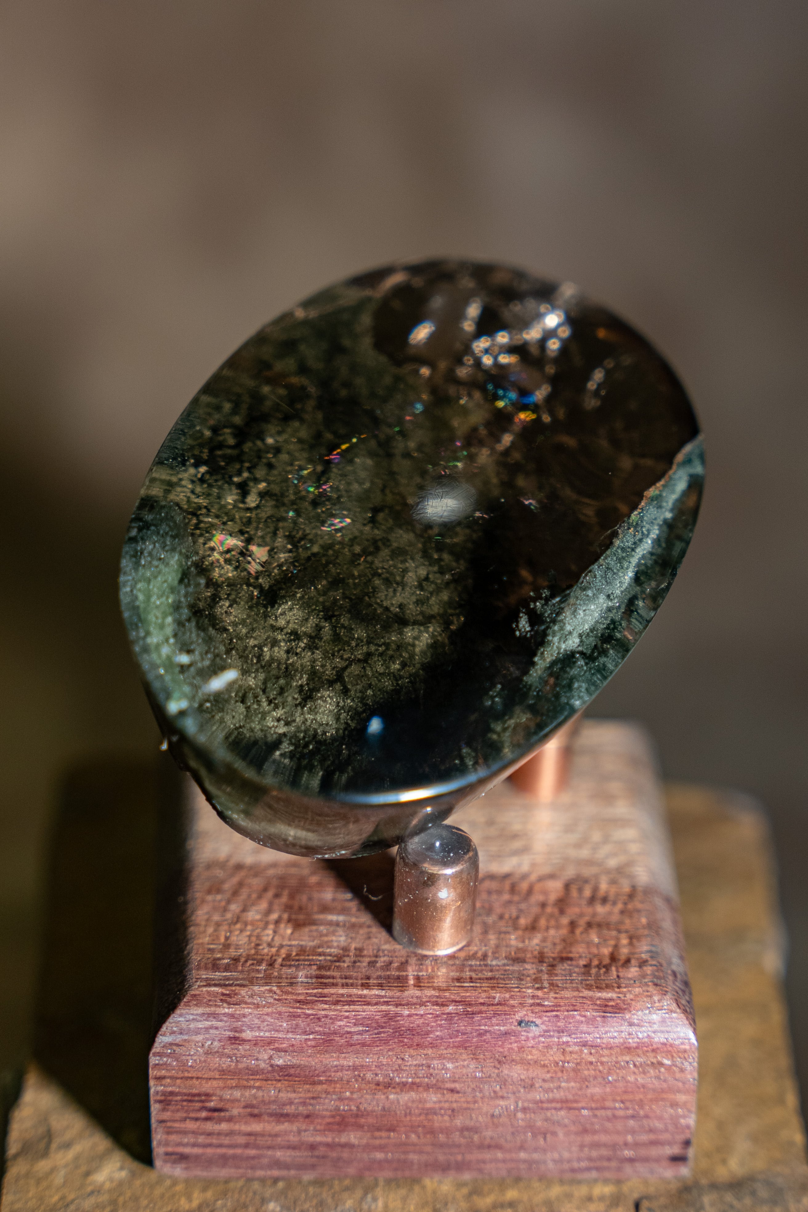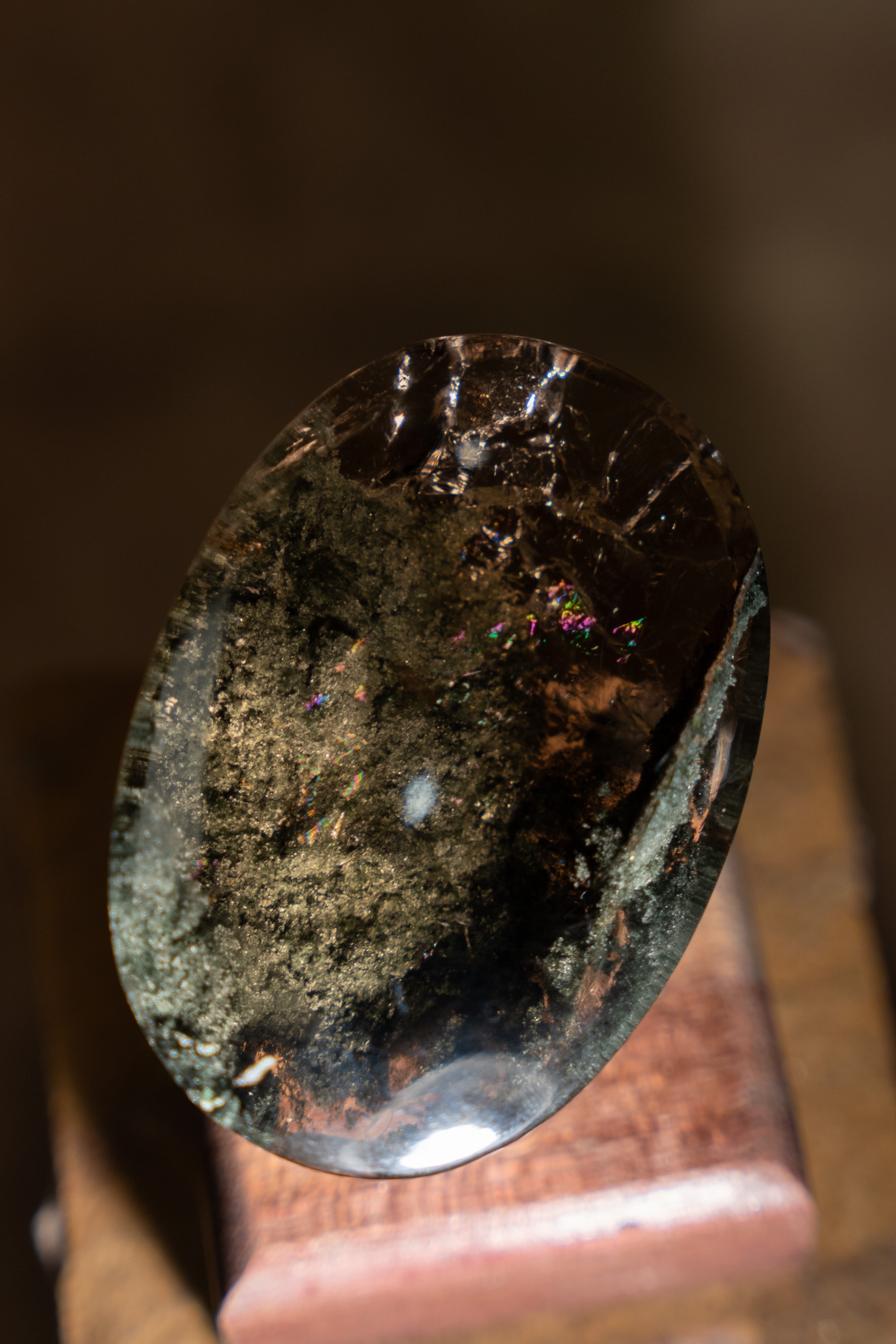 大きな虹も内包しており、艶やかな水晶の中にクローライトが織りなす世界は、