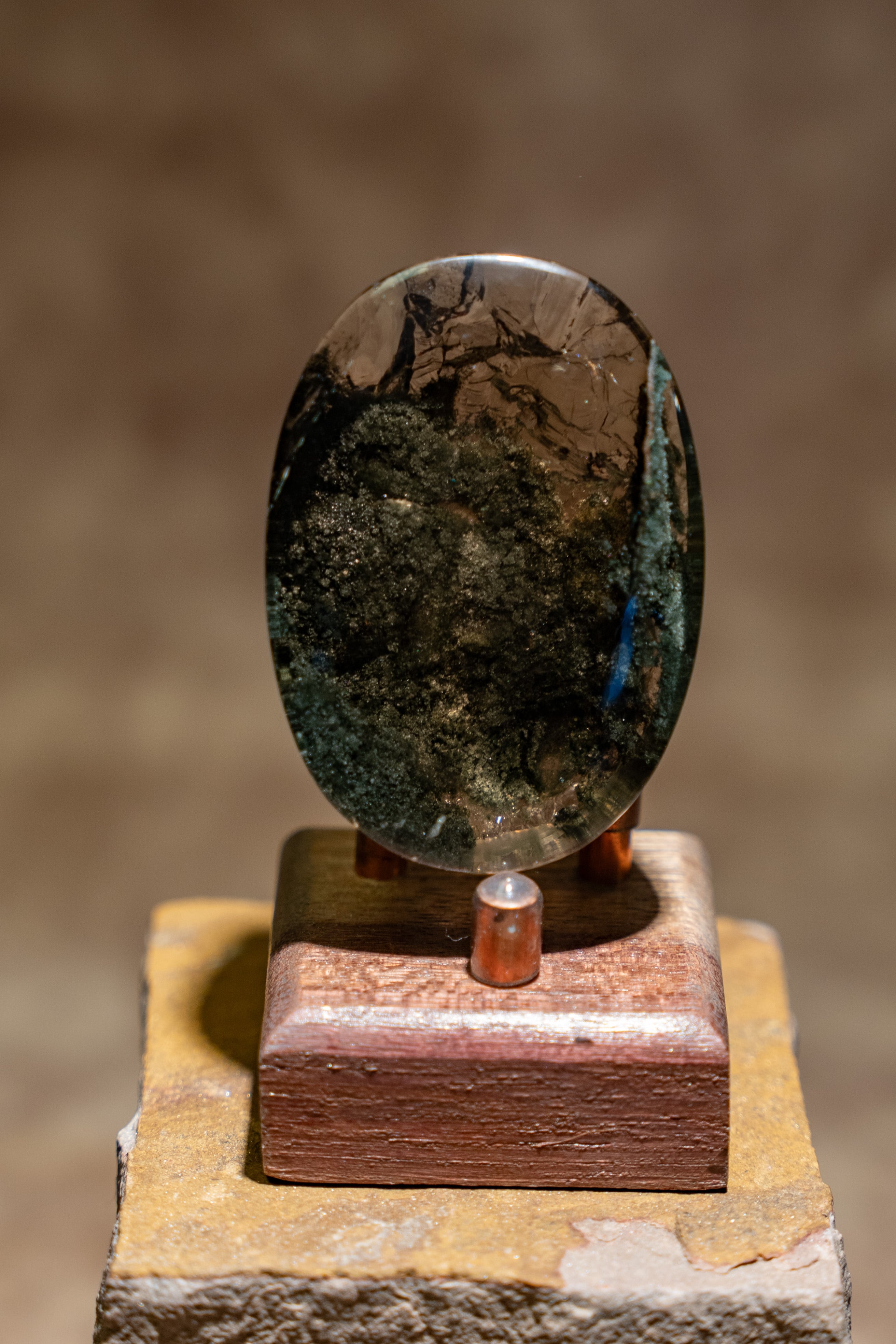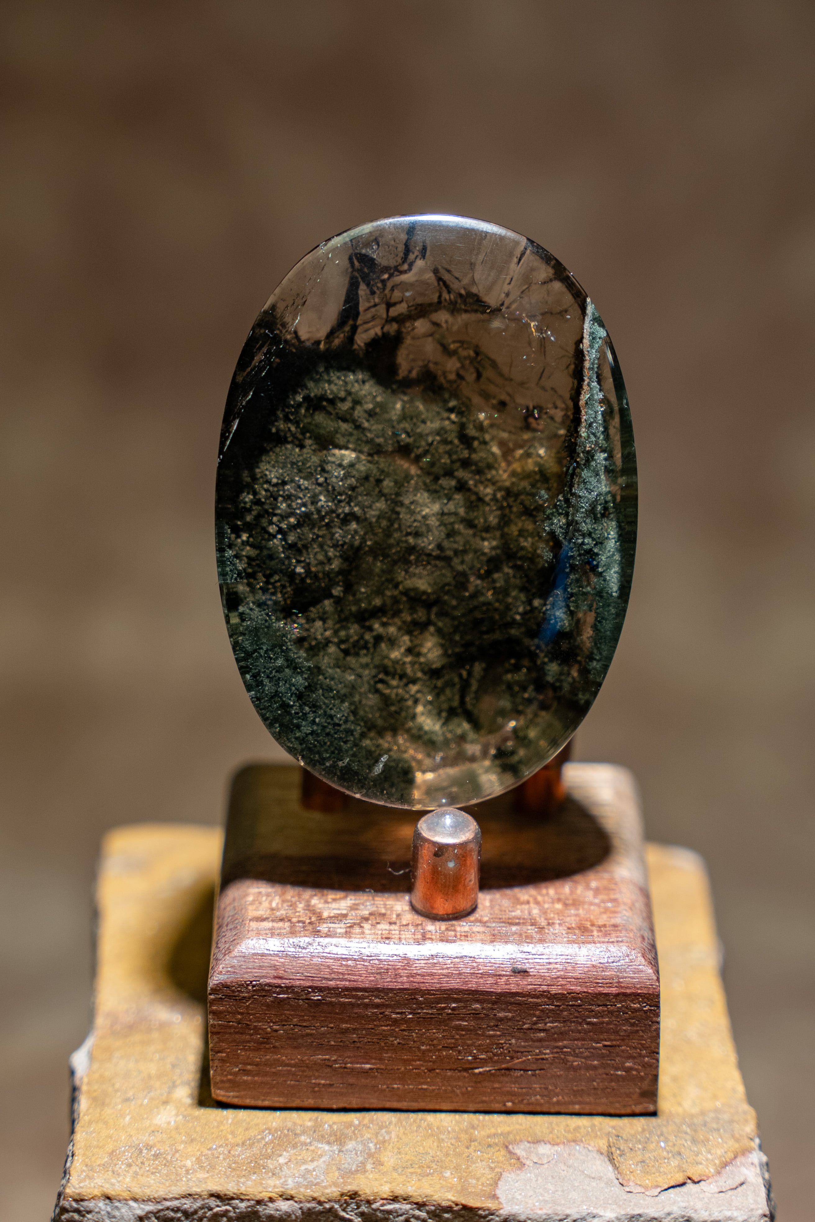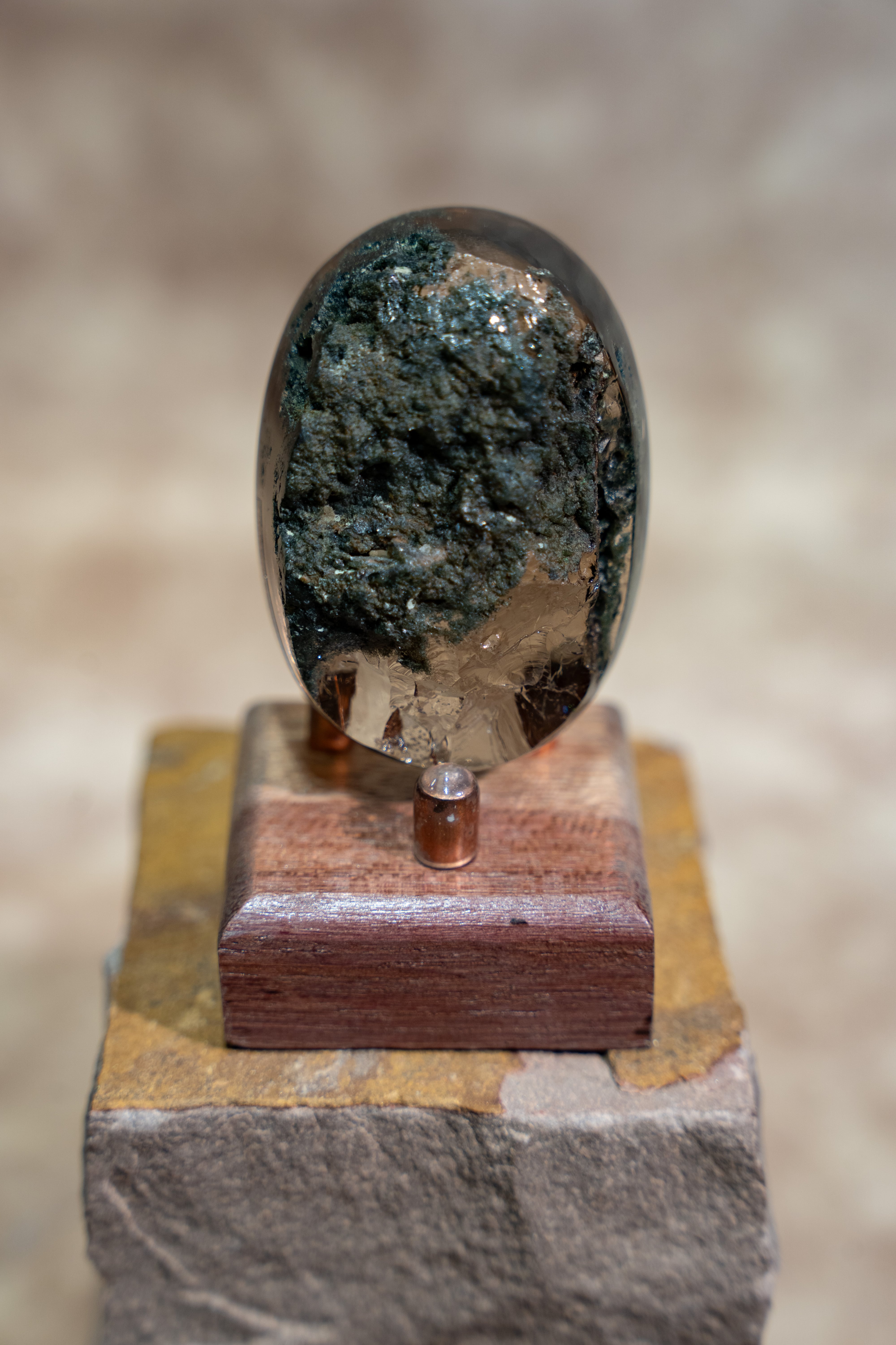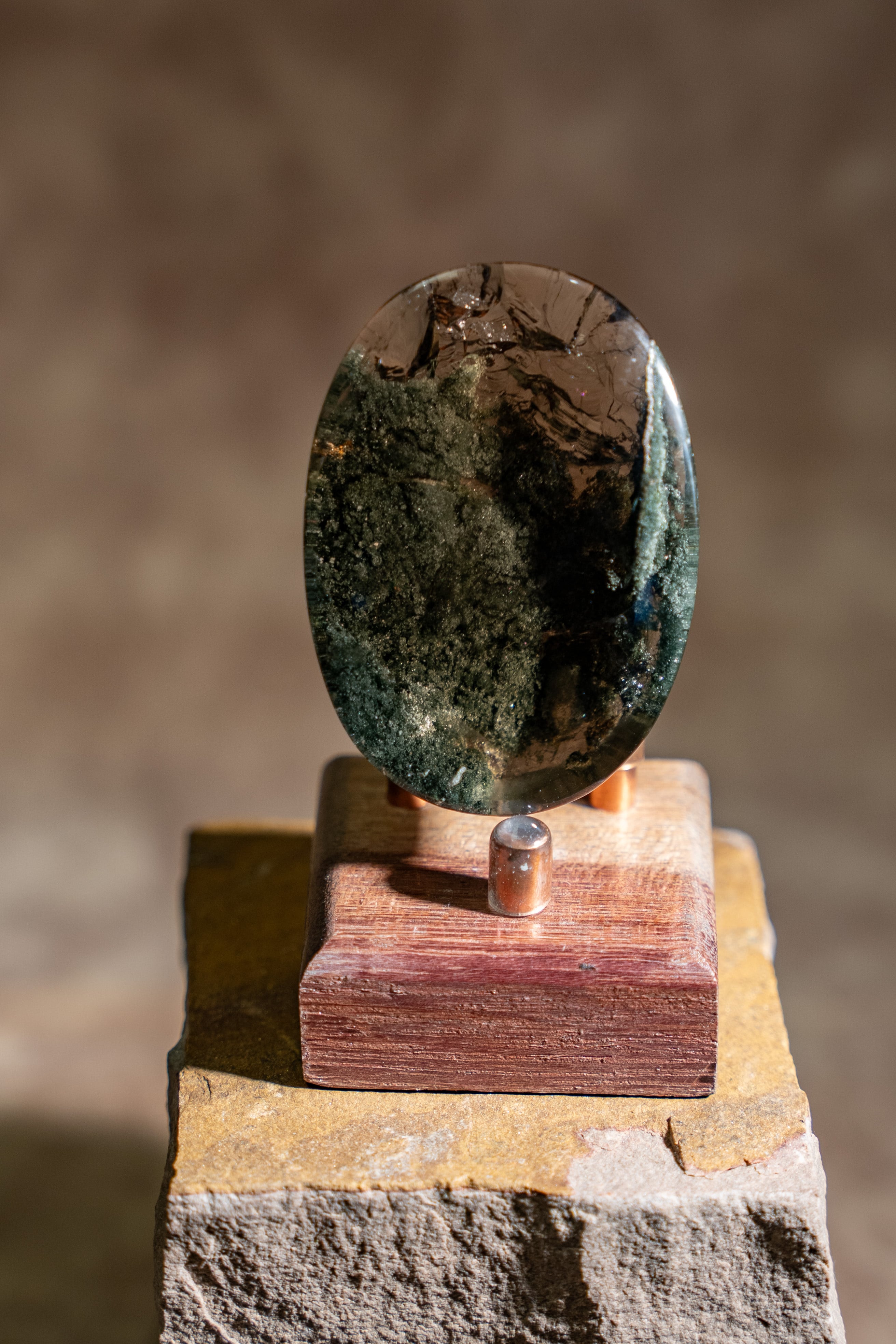大きな虹も内包しており、艶やかな水晶の中にクローライトが織りなす世界は、