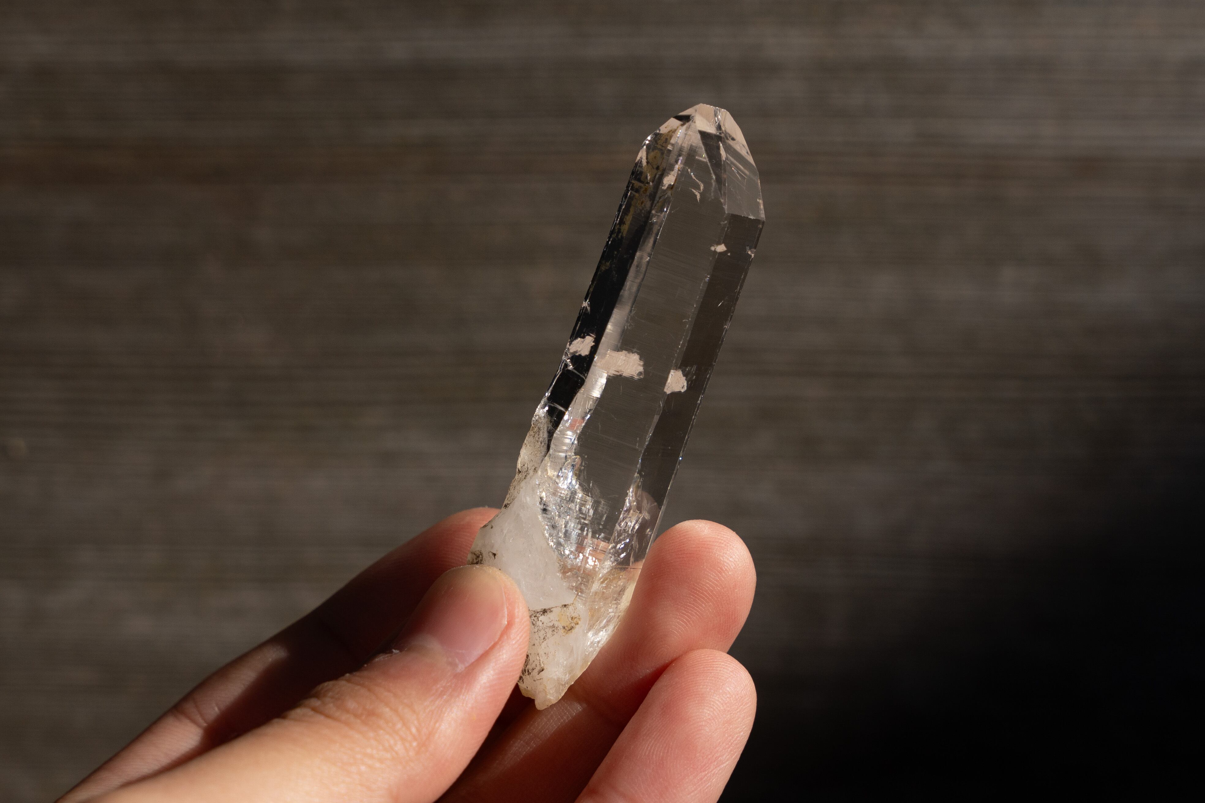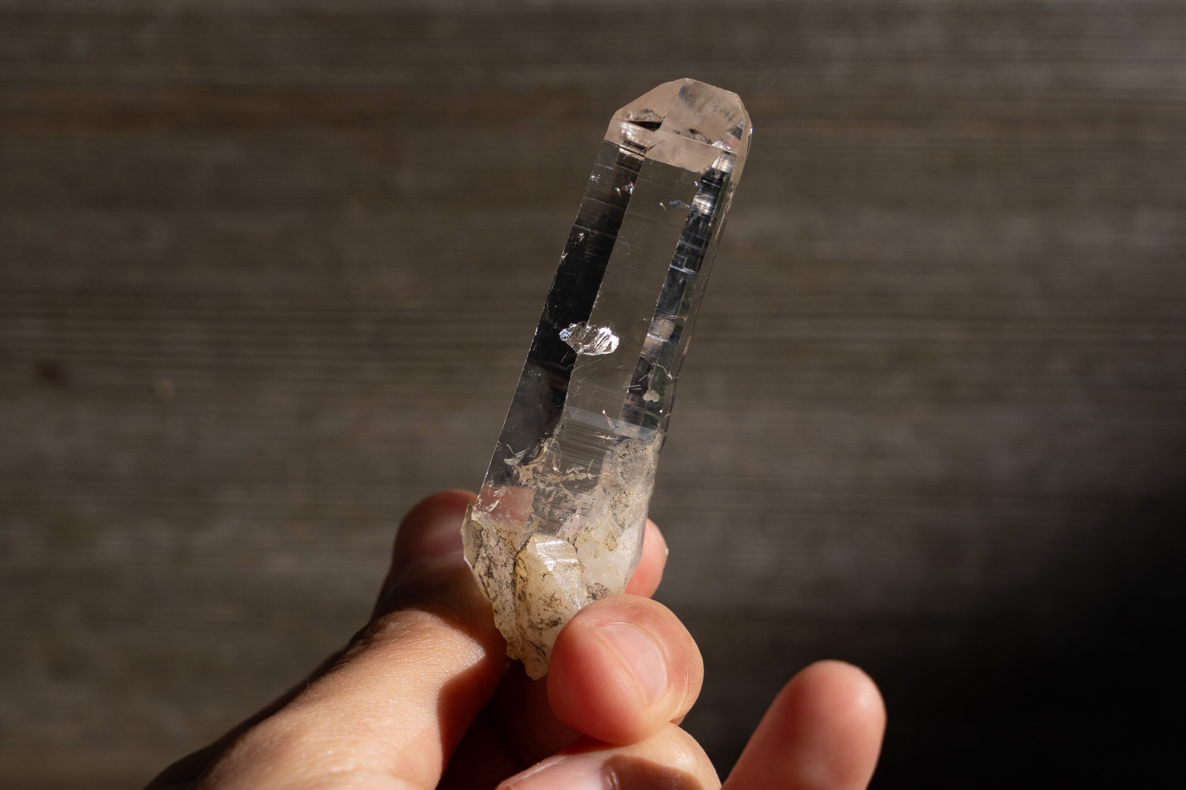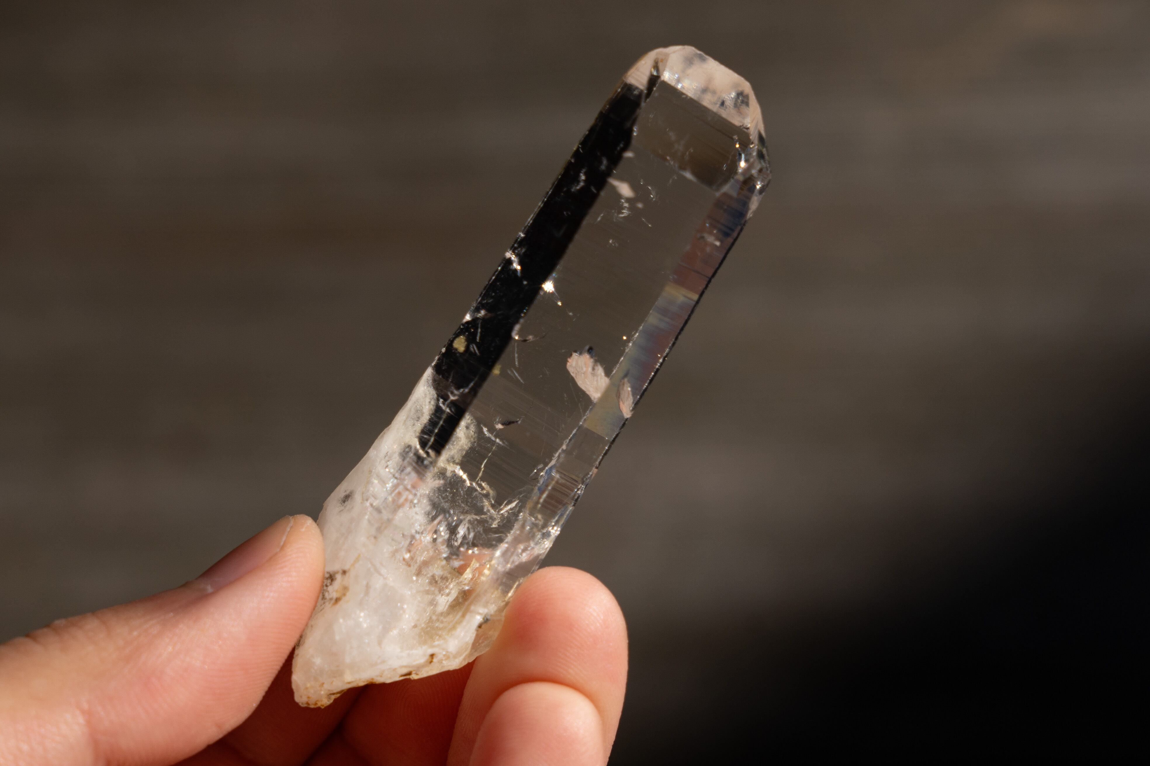 この鉱山の特徴として、真っ直ぐで長く、先端にかけて細くなる形状をした結晶が多く産出されます。これはクル地区産の水晶では珍しく、近くのブリハスパティーやマニハールではこのような形状の結晶があまり産出されません。