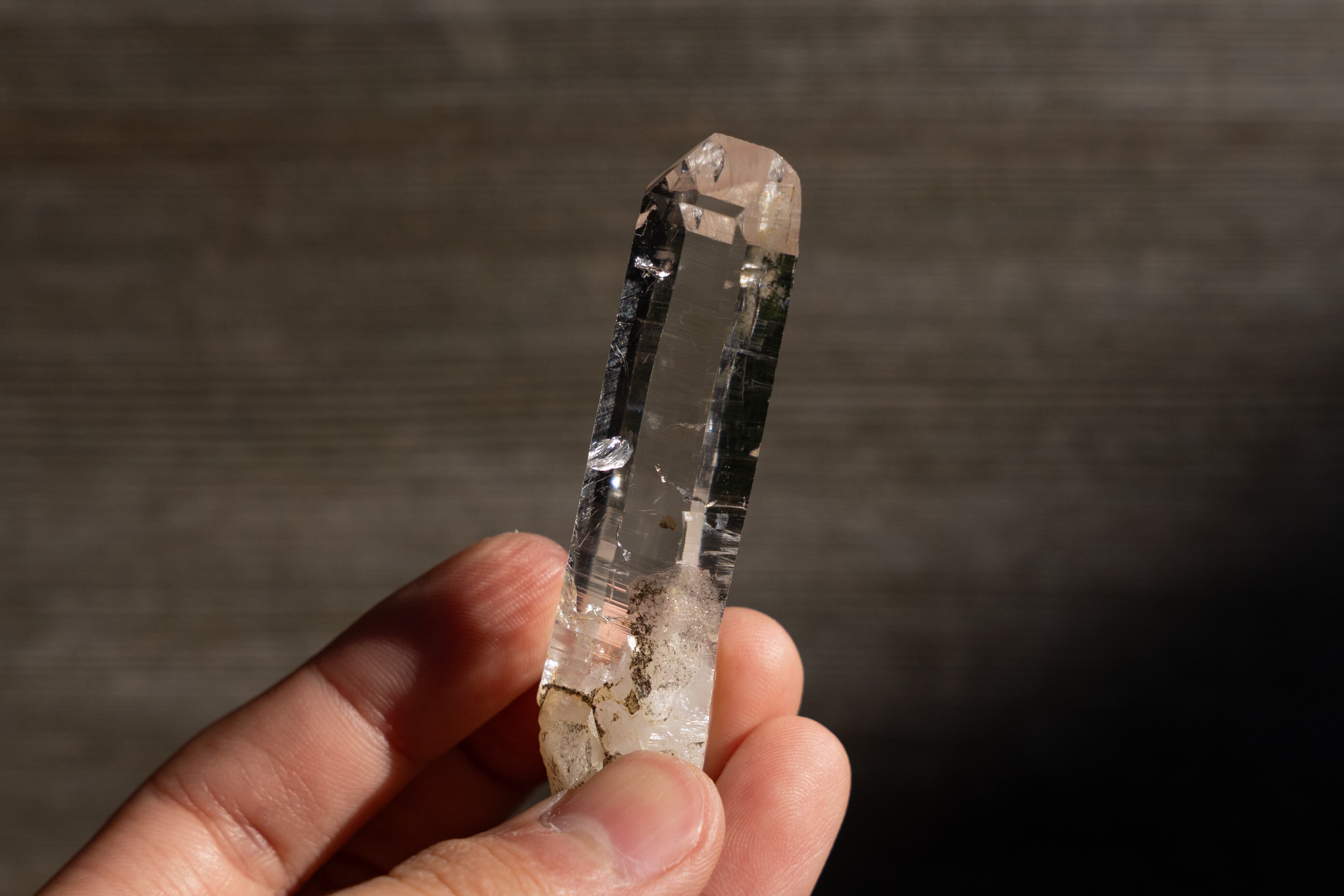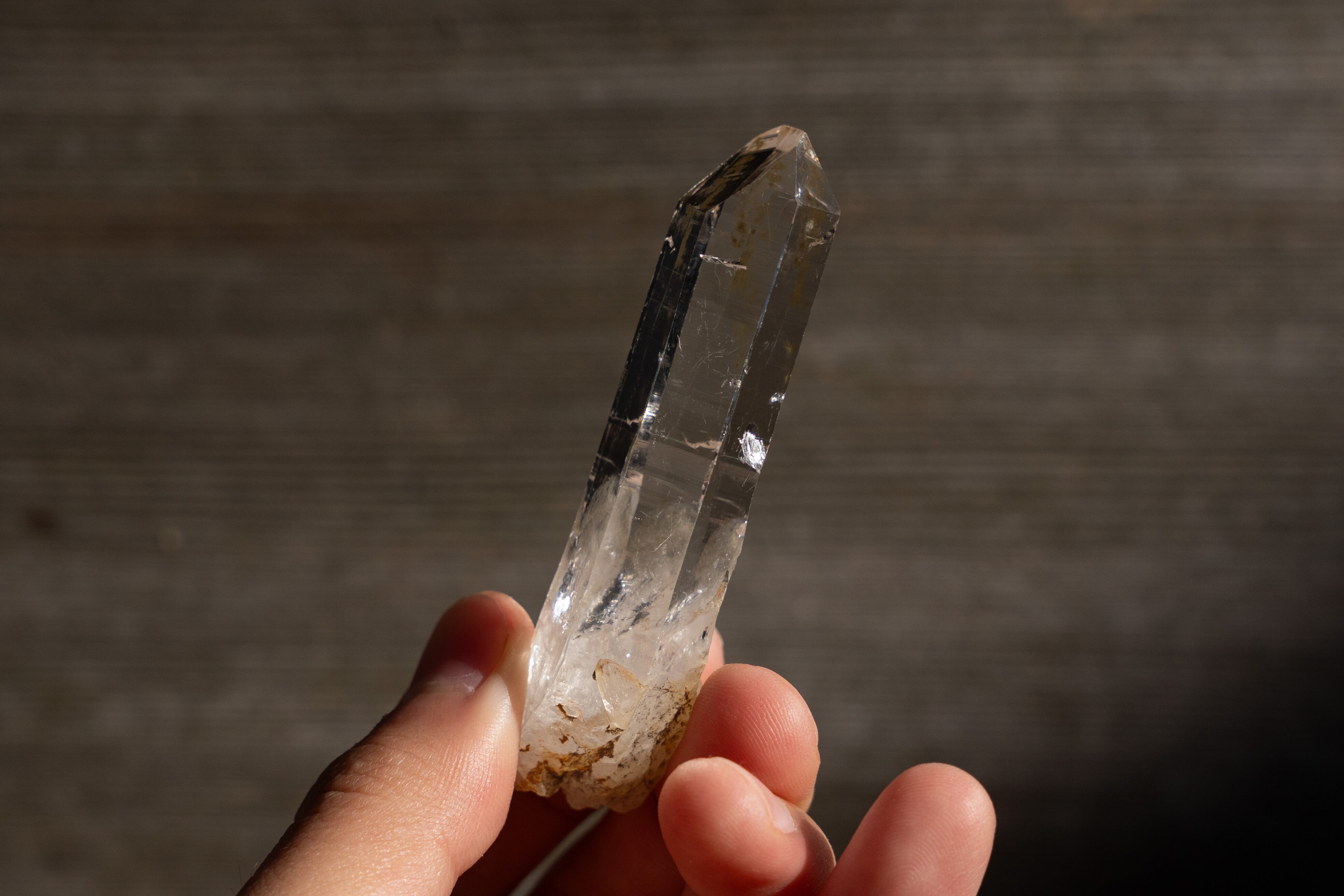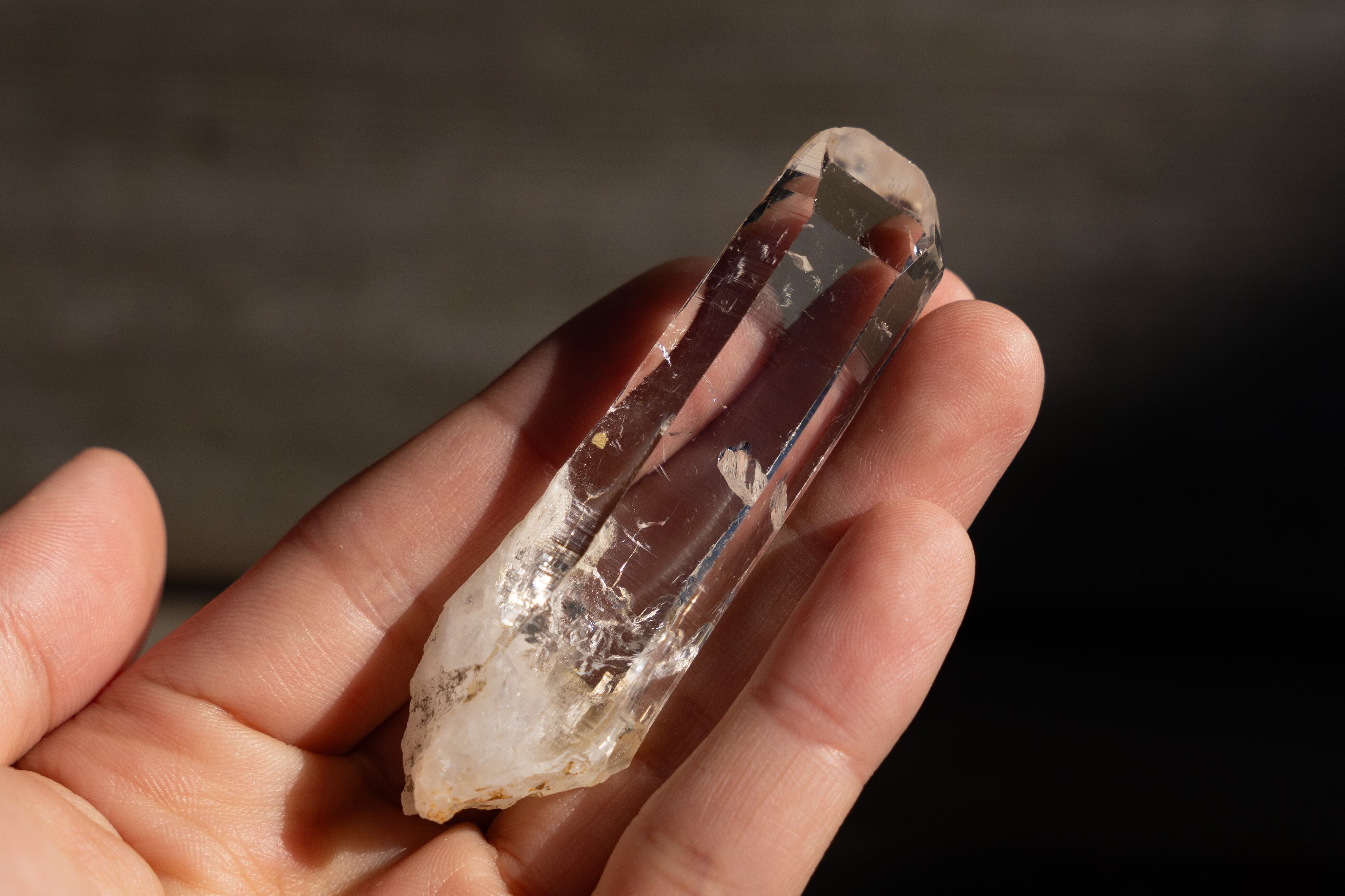 この鉱山の特徴として、真っ直ぐで長く、先端にかけて細くなる形状をした結晶が多く産出されます。これはクル地区産の水晶では珍しく、近くのブリハスパティーやマニハールではこのような形状の結晶があまり産出されません。