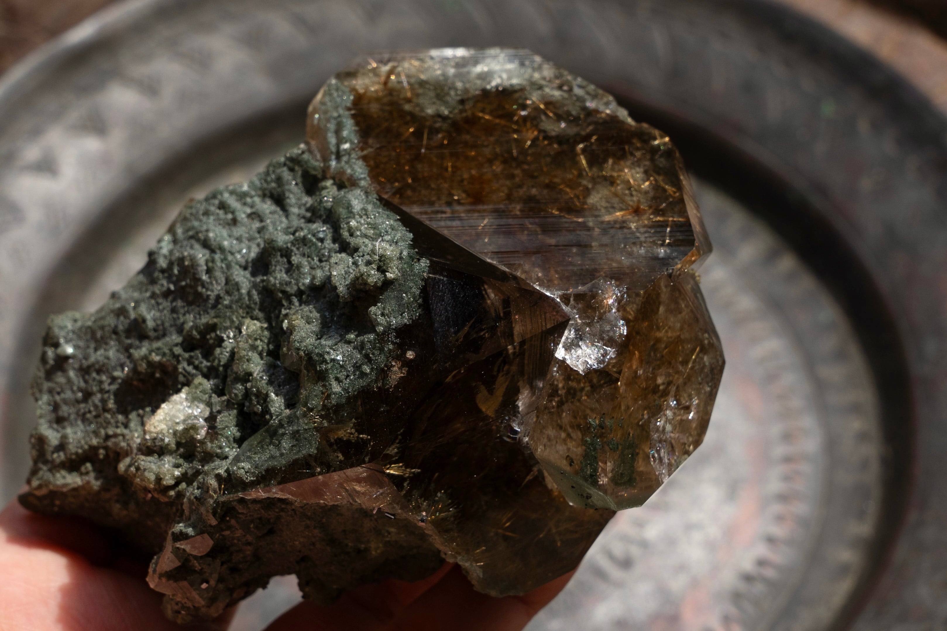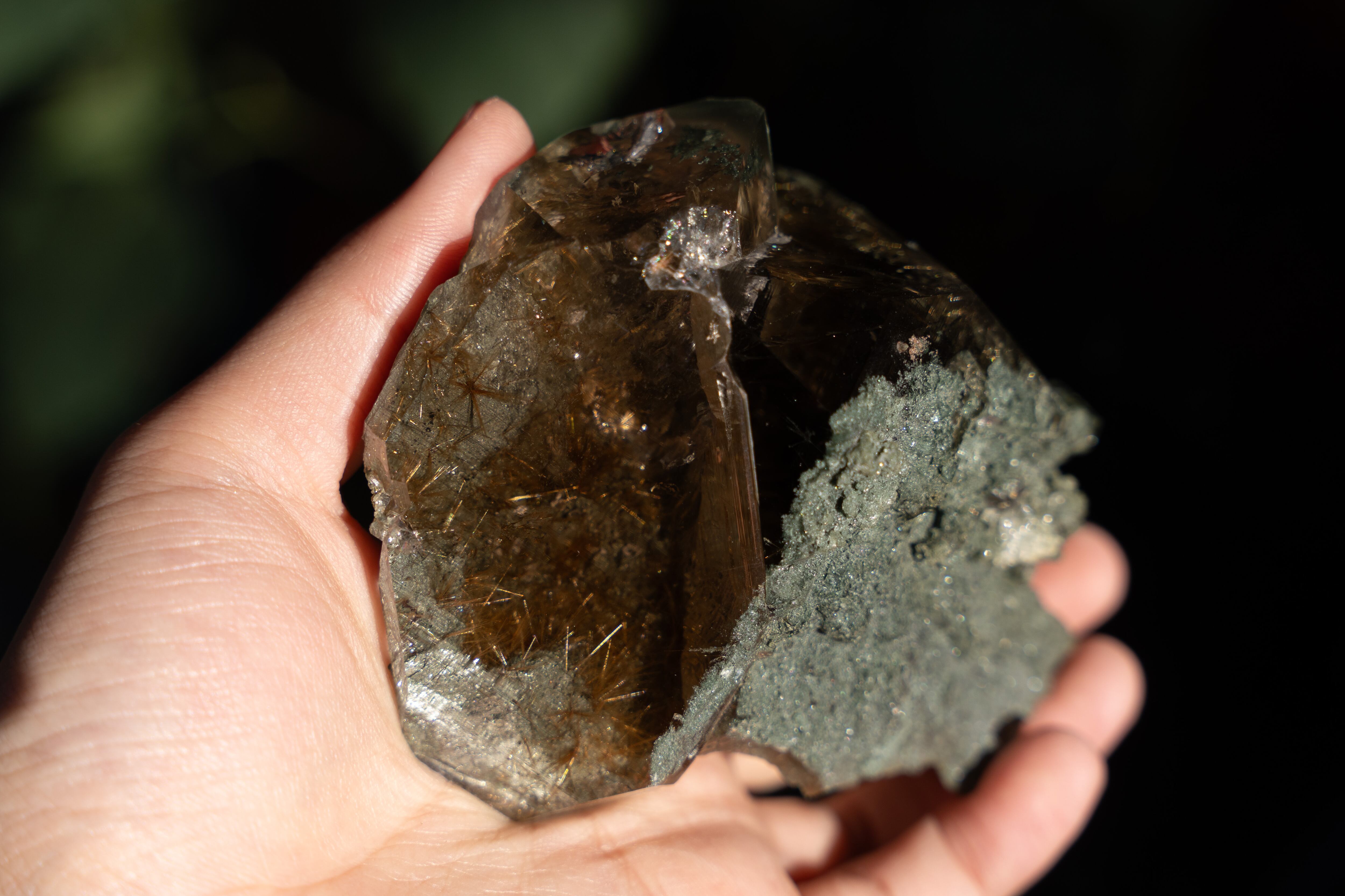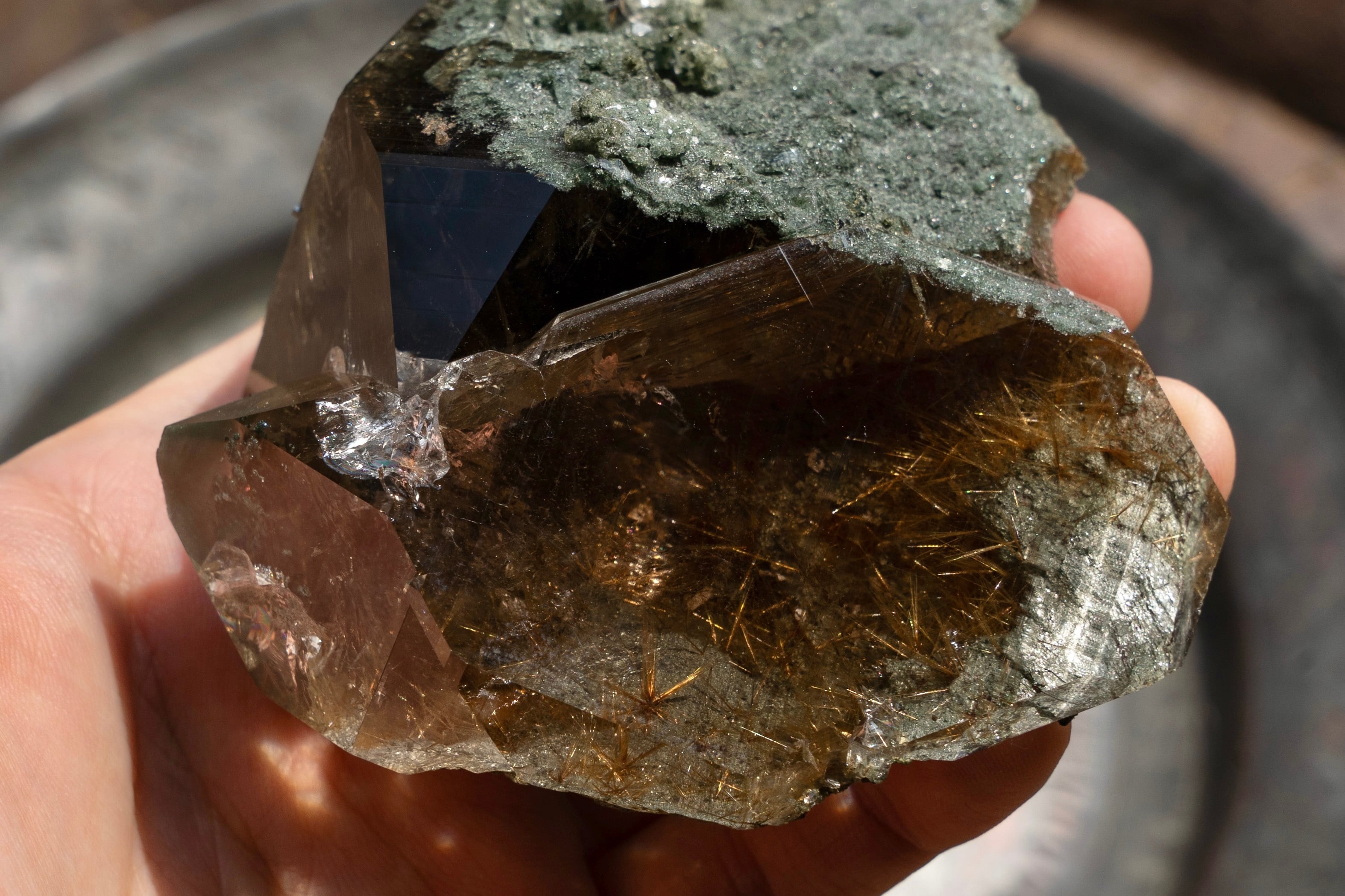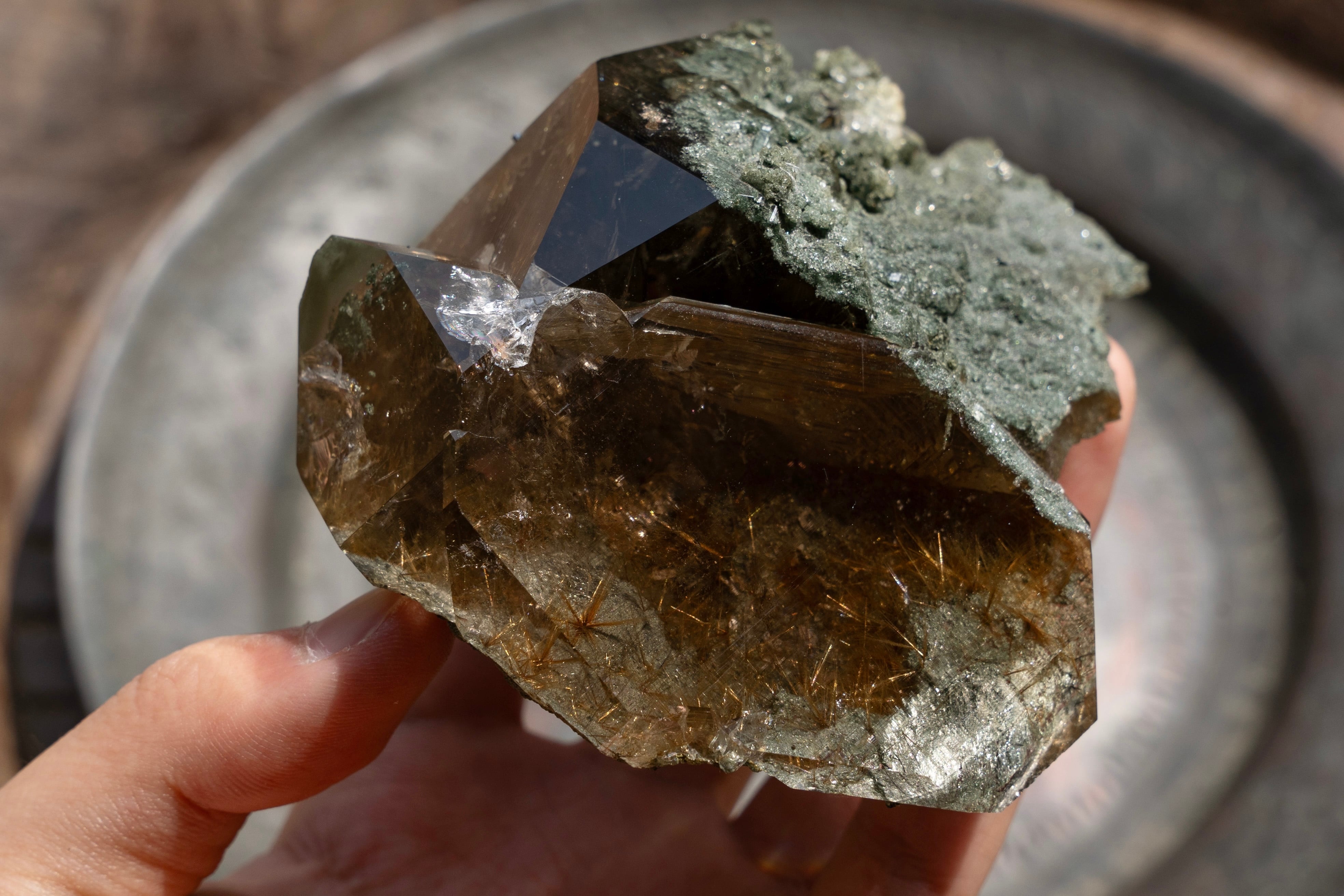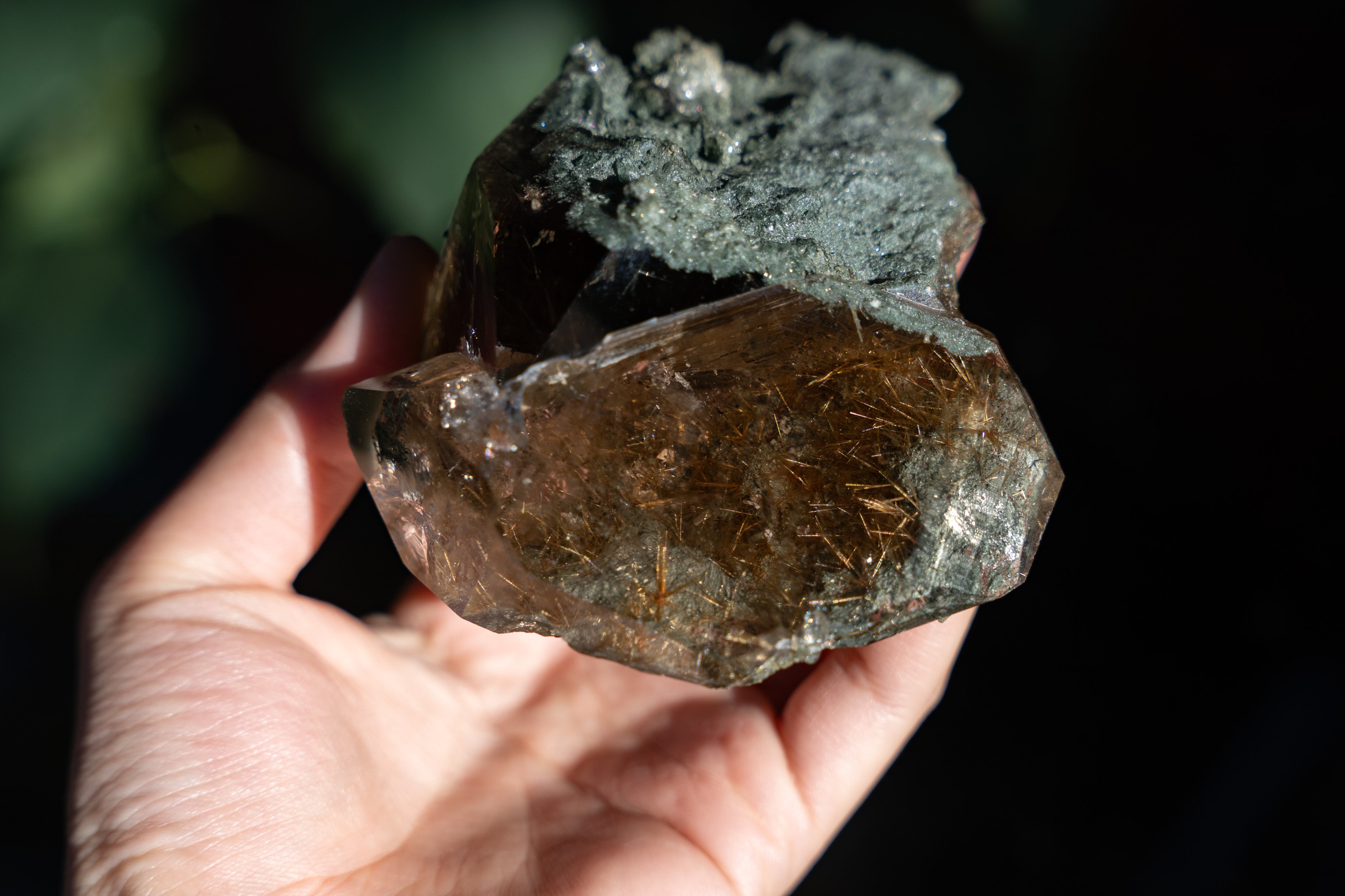 深緑色のクローライトの母岩から成長したスモーキークォーツの内部に、
