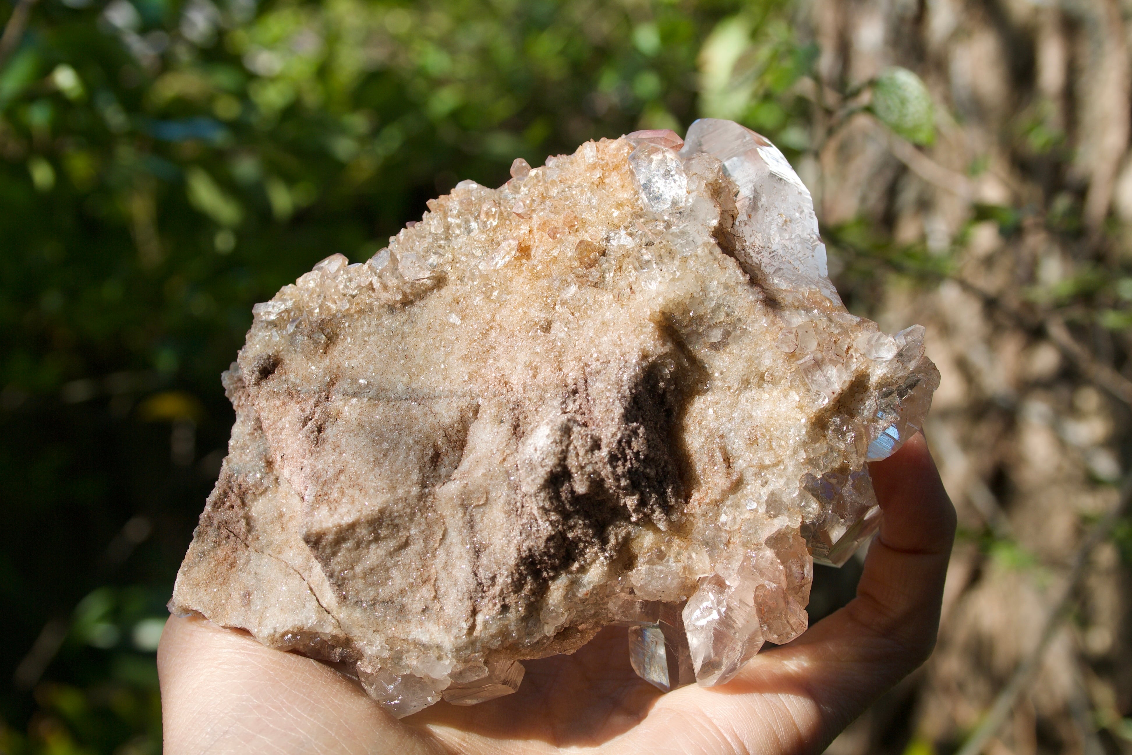 この水晶は柔らかく透き通るような透明感と艶やかな照りを有しており、酸化鉄の影響により、結晶部分は淡いピンク色、母岩の上面はオールドローズ色をしています。