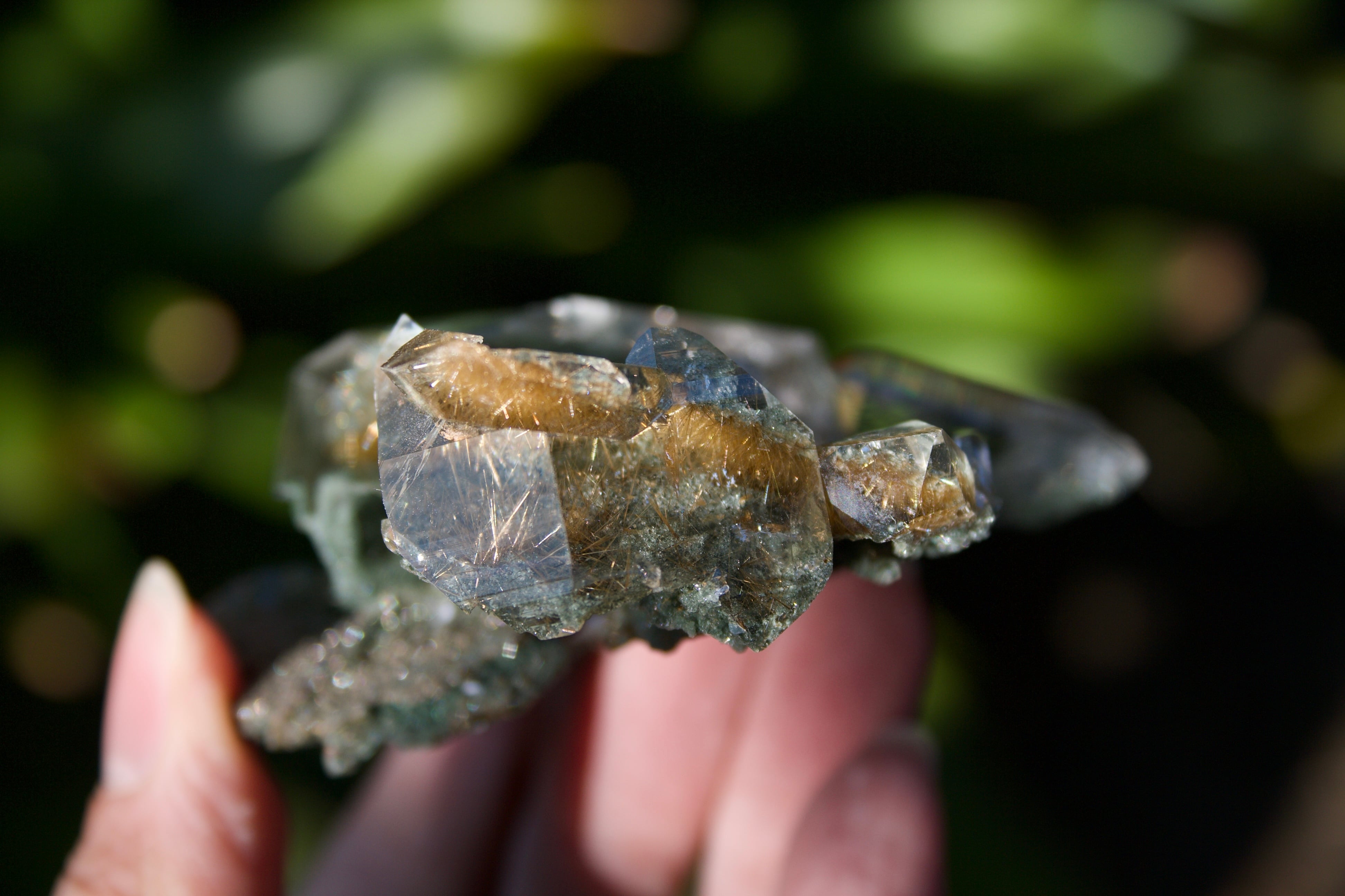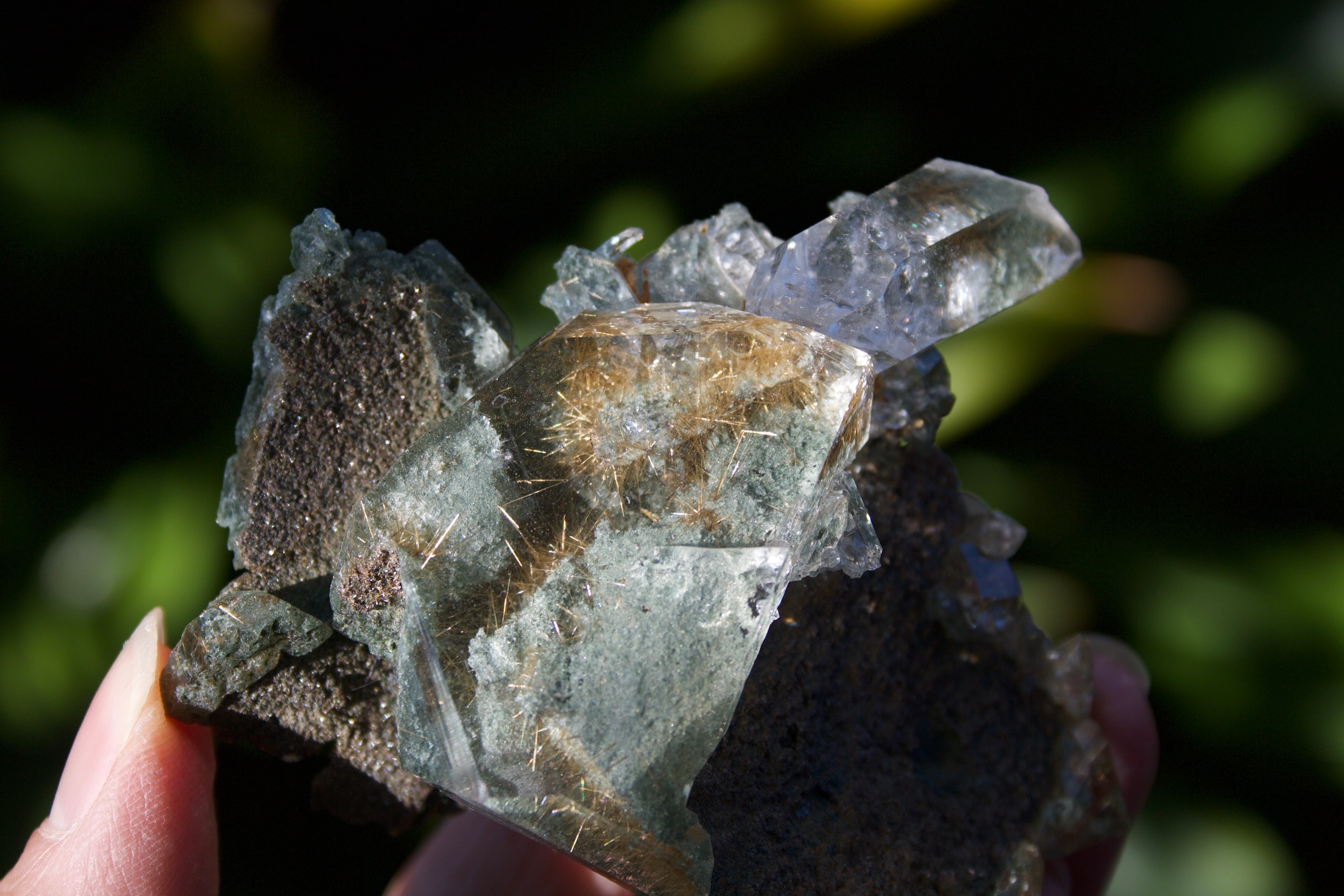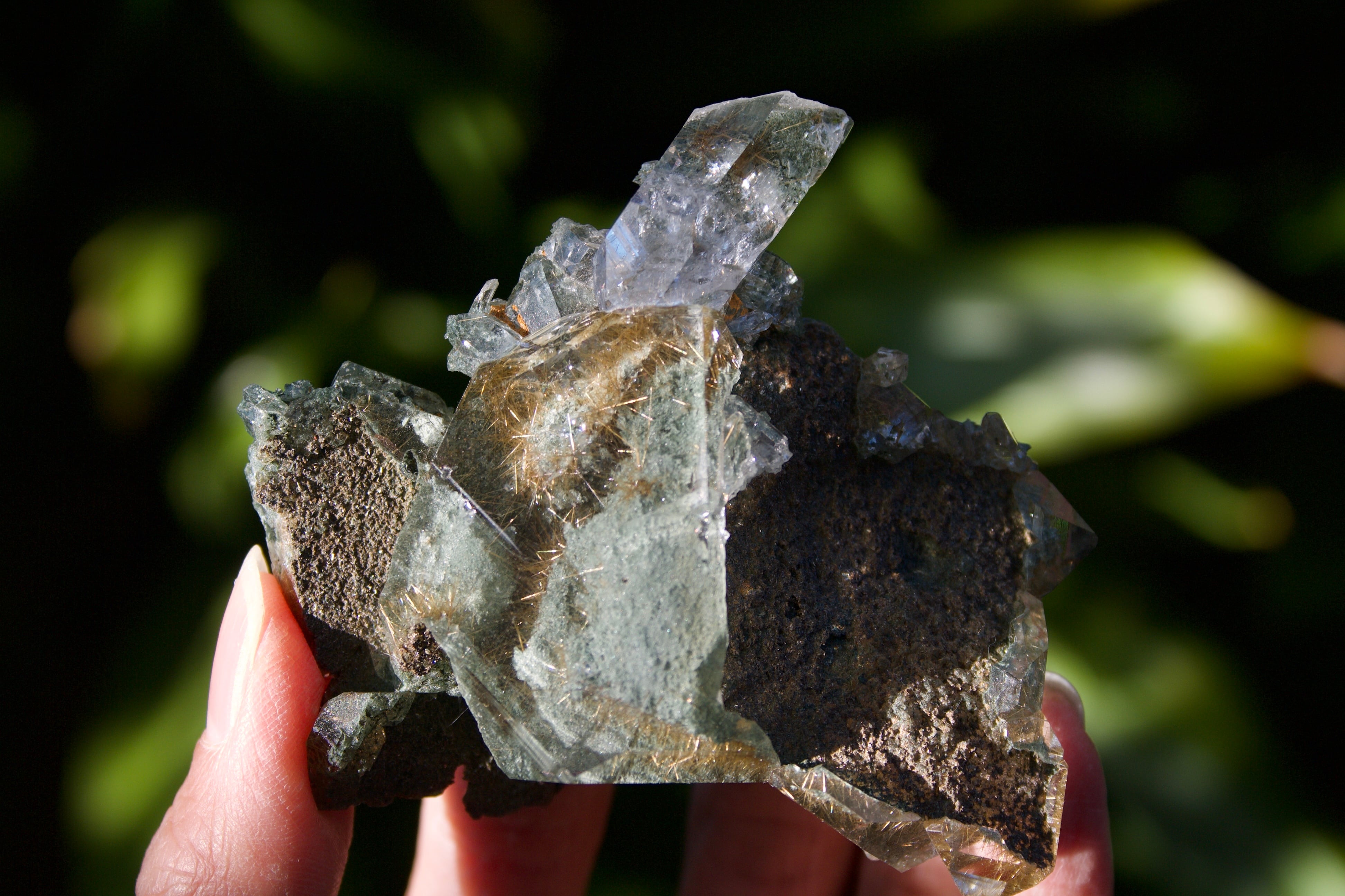 透明感溢れる水晶の内部に拡がっている、クローライトの深緑の世界と、ルチルの煌びやかな世界のコントラストが美しく、様々な角度からこの水晶の輝きを堪能することができます。