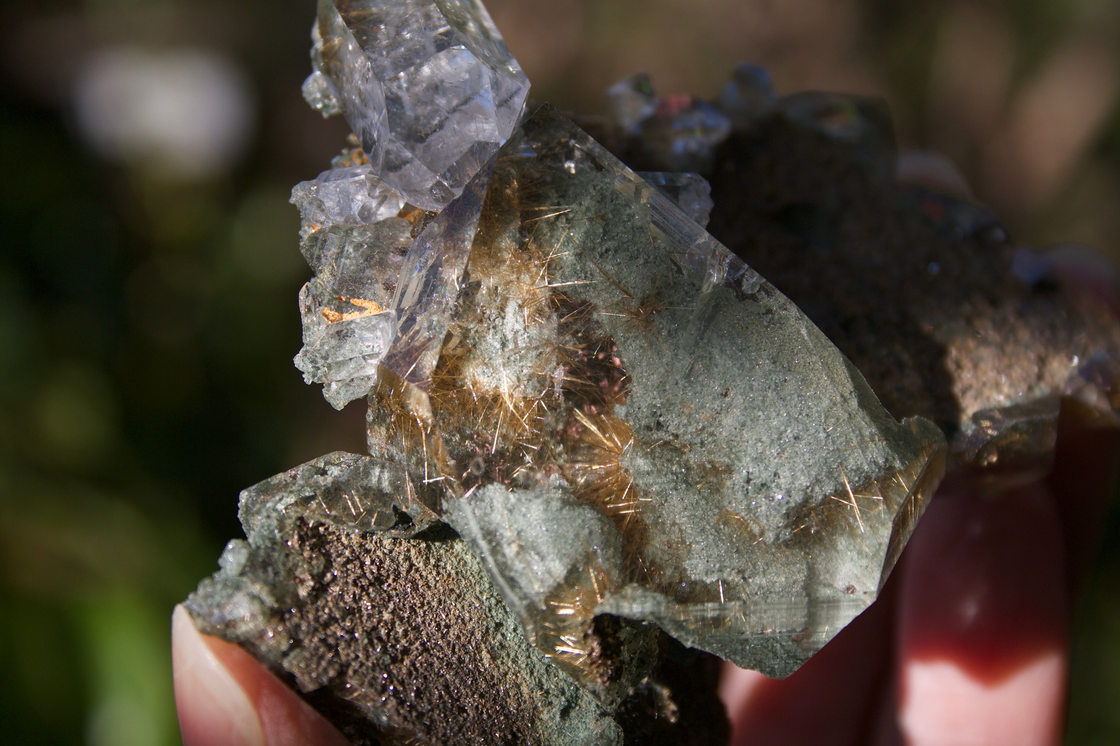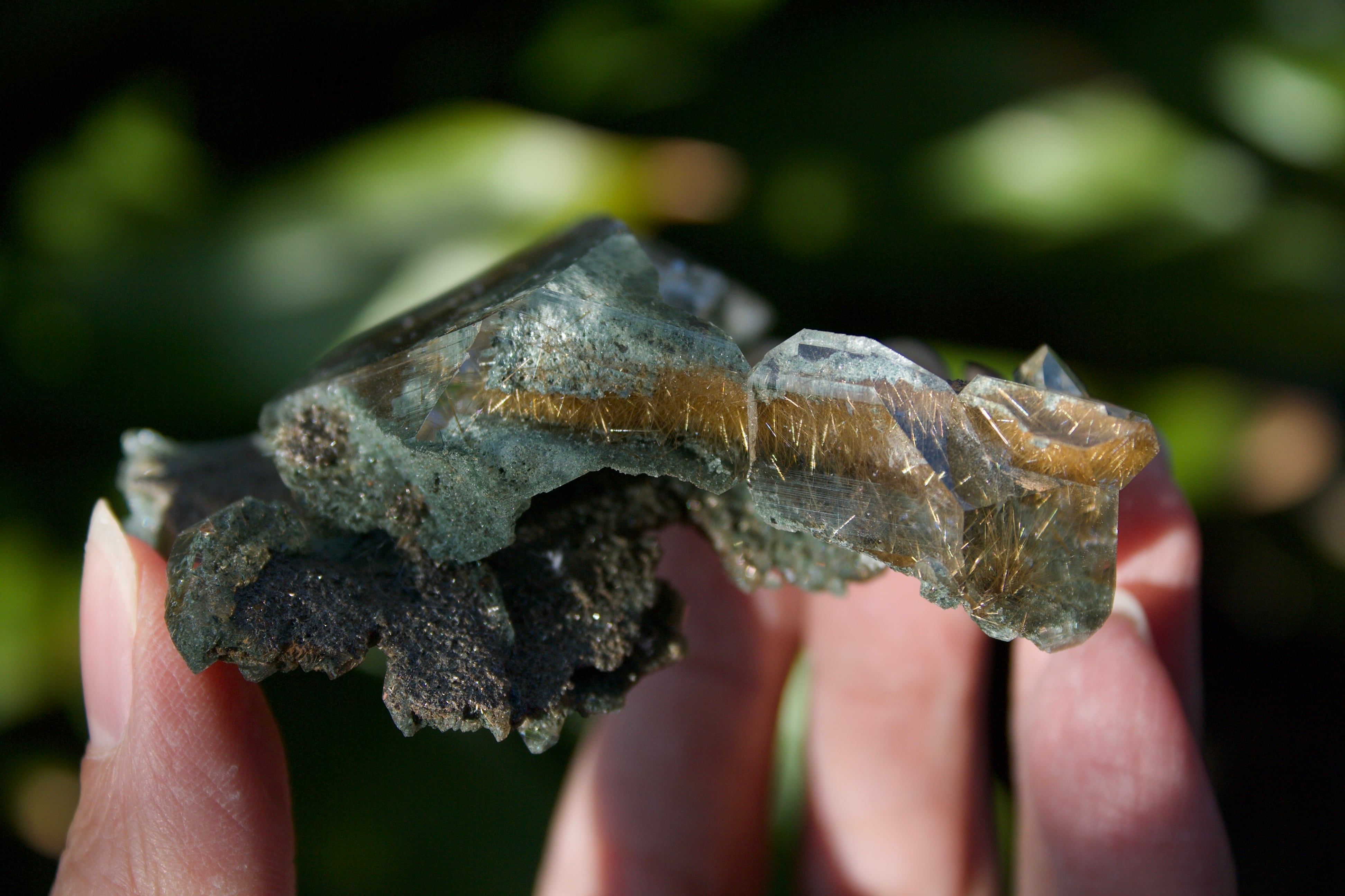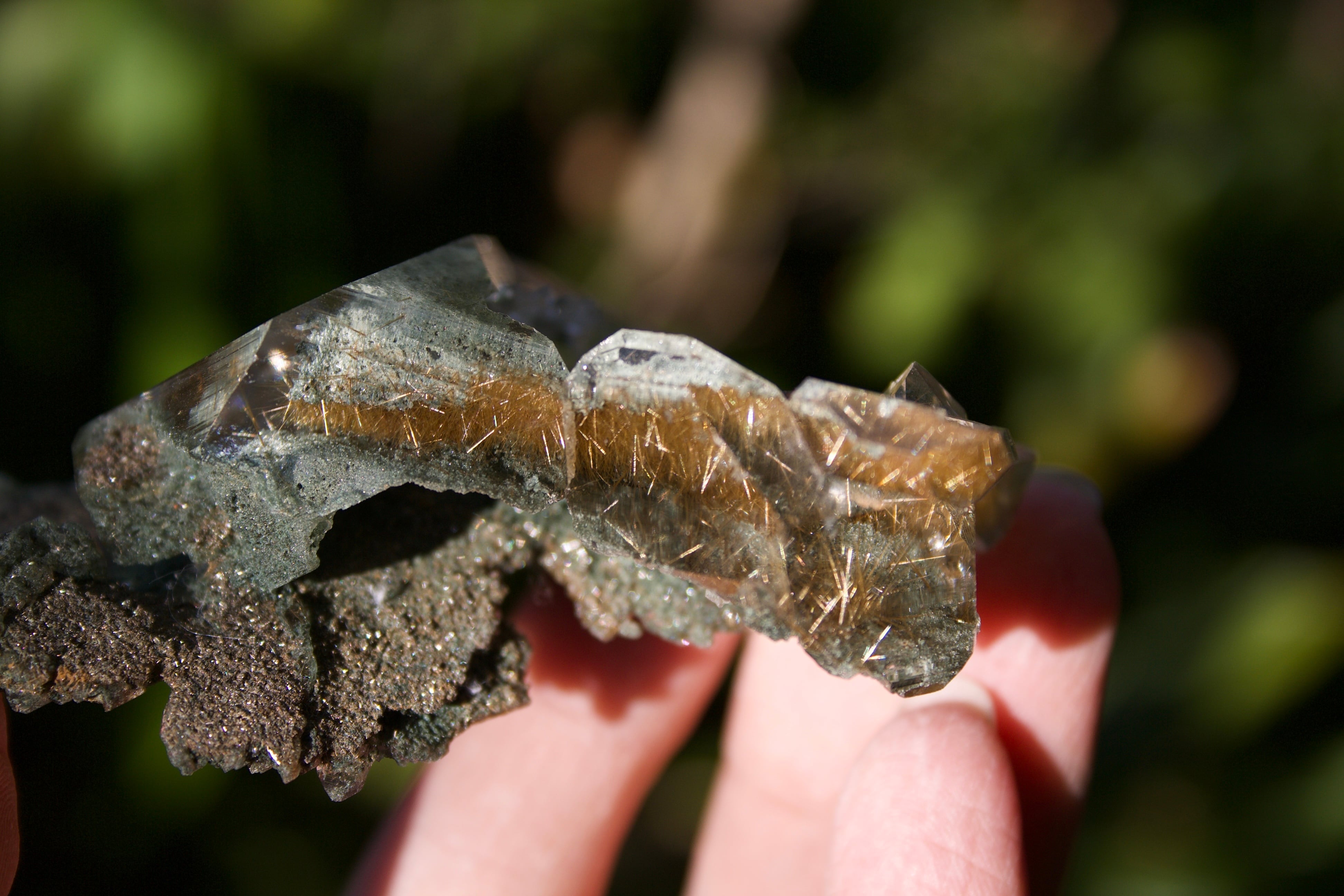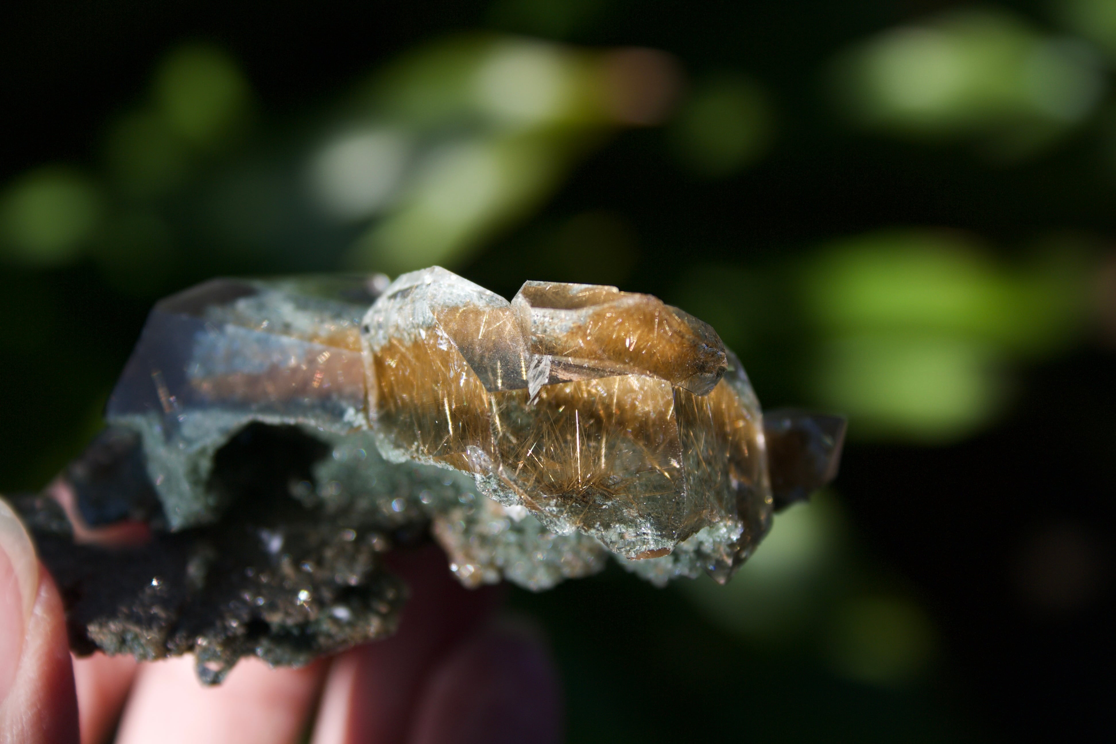 透明感溢れる水晶の内部に拡がっている、クローライトの深緑の世界と、ルチルの煌びやかな世界のコントラストが美しく、様々な角度からこの水晶の輝きを堪能することができます。